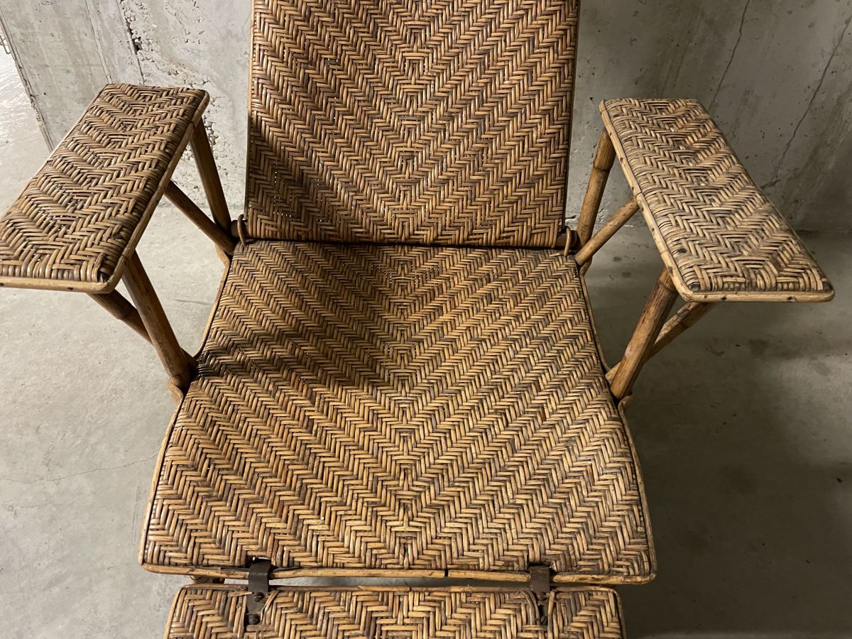 Superbe chaise longue transat en rotin et bois des années 40, dossier rabattable, repose-pieds amovible, traces d’usage (voir photos), assise en très bon état, chaise très solide et stable, 4 niveaux de réglage, hauteur totale dossier 100cm, hauteur assise 42cm, encombrement hors tout L.80xP.80cm, assise 50x50cm, longueur totale de l'assise avec le repose-pieds 110cm.