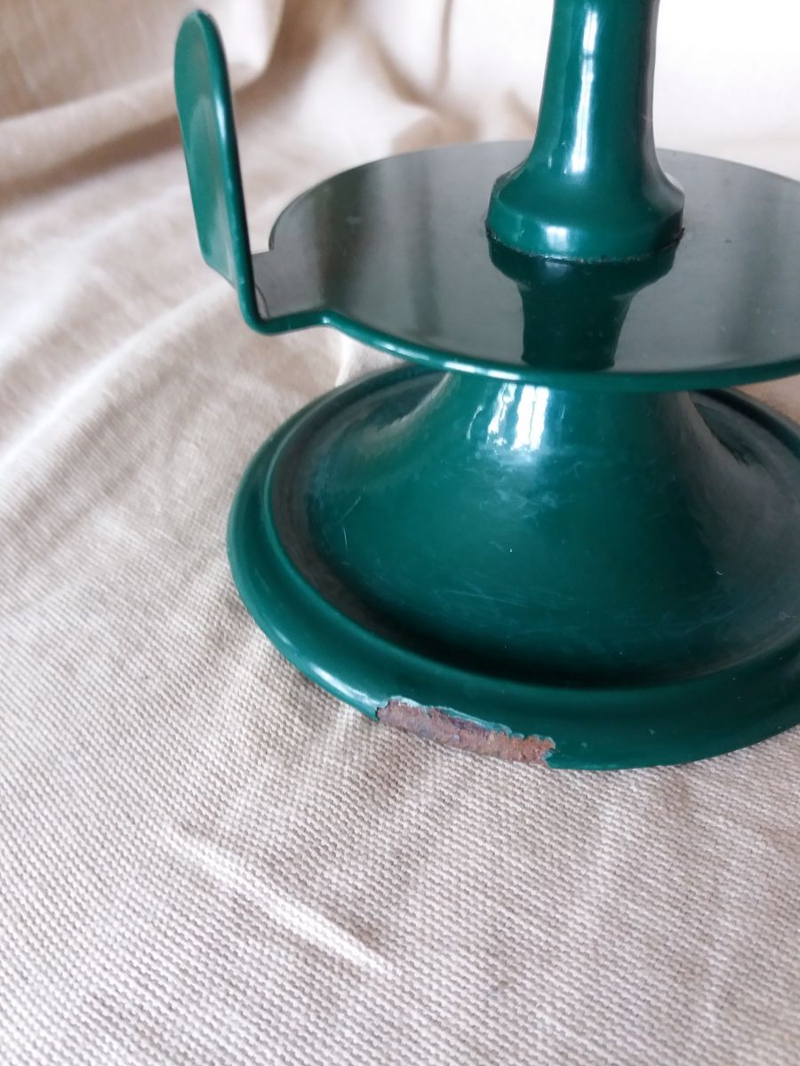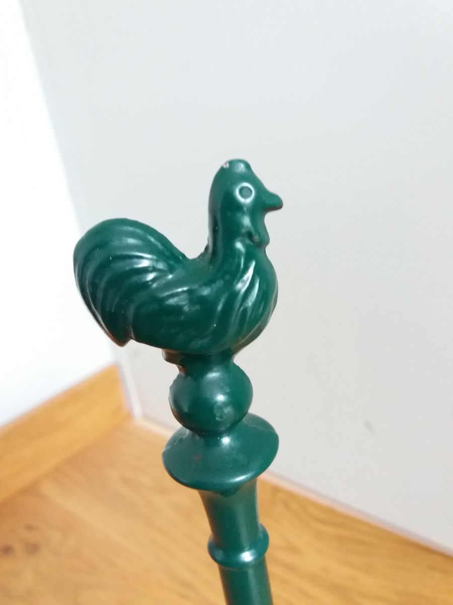 Dévidoir en fonte laqué verte, avec un socle très lourd le rendant bien stable, décoré d’un coq sur l’extrémité. Il pourra servir de dérouleur à sopalin (ou d’un autre papier, on pourra alors empiler deux rouleaux ;) mais on peut lui trouver d’autres usages, notamment dans un atelier pour le bricolage, la couture en y empilant plusieurs rouleaux d’adhésifs différents, de rubans, de ficelle par exemple. Il peut même servir de cale-porte amusant à l’occasion ! Je suis totalement incapable de le dater, je n’avais jamais vu ce genre d’objet avant celui-ci, mais s’il est prévu pour du sopalin, j’imagine qu’il ne doit pas être très ancien. Il est en bon état structurel, solide, stable, mais comporte 3 manques sur la laque verte qui laissent apparaître de la corrosion (superficielle) et des marques et rayures, ces défauts sont localisés sur le socle de l’objet. Il mesure 36 cm de hauteur, le socle mesure 10,5 cm de diamètre, le coq mesure 4,5 cm de largeur pour 2 cm d’épaisseur. Il pèse environ 1,1 kg.