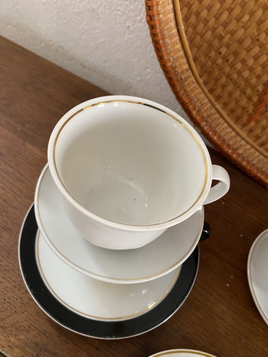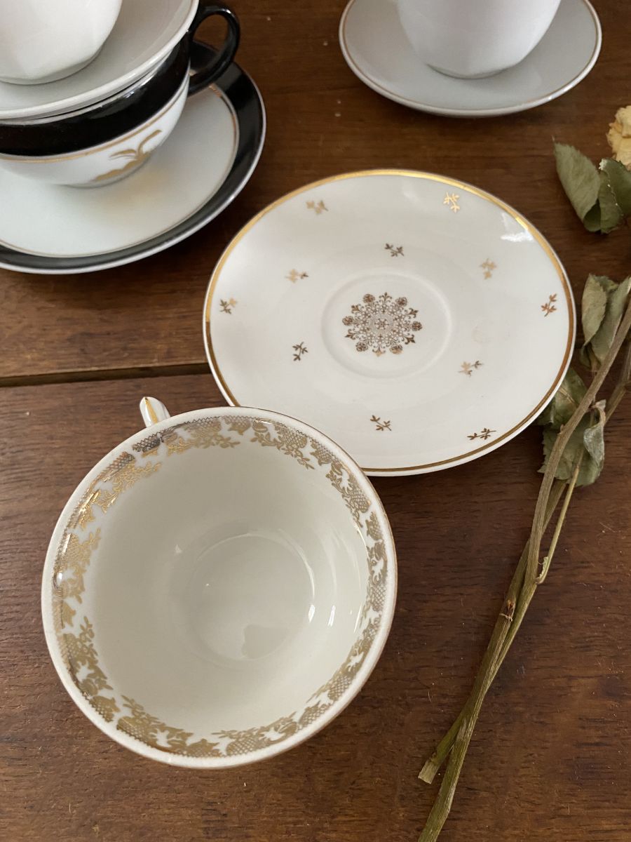 5 tasses à café et sous tasses en blanc, noir et doré.3 sont en porcelaine.2 plus grandes ont un décor doré peint à la main, elles viennent d Espagne.1 à un motif de fleurs dorées,avec la sous tasse assortie.Diamètre entre 8 et 9,5 cm.