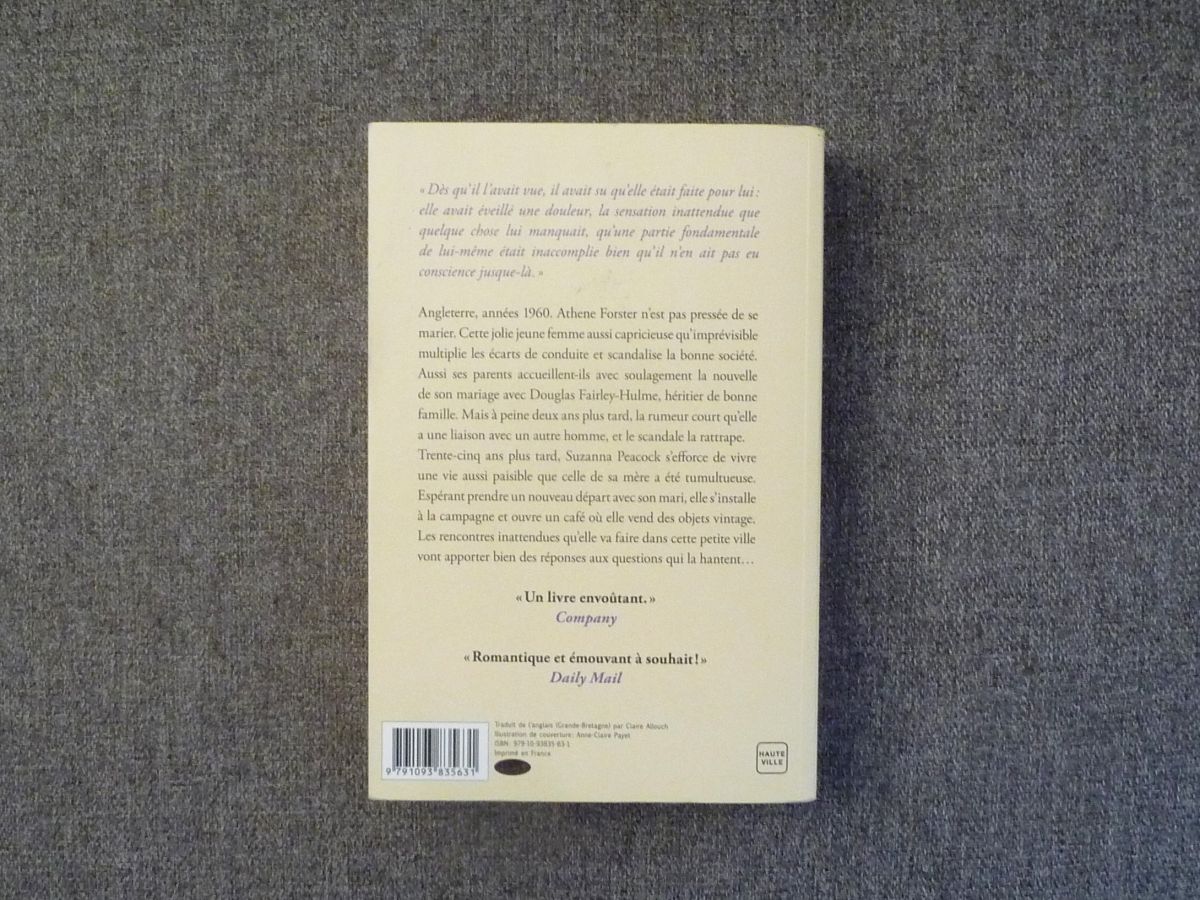 Pur produit des années soixante, Athene Forster n'est pas pressée de se marier. Cette jolie fille trop gâtée est devenue une jeune femme aussi capricieuse qu'imprévisible, et elle multiplie les écarts de conduite. Aussi ses parents accueillent ils avec soulagement la nouvelle de son mariage avec Douglas Fairley Hulme, héritier de bonne famille. Mais à peine deux ans plus tard, la rumeur court qu'elle a une liaison, et le scandale la rattrape. Trente cinq ans plus tard, Suzanna Peacock s'efforce de vivre une vie aussi paisible que celle de sa mère a été tumultueuse. Elle s'installe à la campagne avec son mari, Neill, qui espère fonder une famille avec elle, et ouvre un café où elle vend des objets vintage. Les rencontres inattendues qu'elle va faire dans cette petite ville vont apporter bien des réponses aux questions qui la hantent... "Un livre envoûtant. "Company" Romantique et émouvant à souhait!" Daily Mail