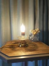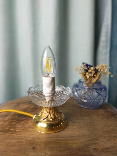 Cette lampe est réalisée grâce à des pièces détachées d'un lustre à pampilles en cristal de bohême. Ici, il s'agit du remploi de la rosace de plafond en laiton ainsi que d'une bobèche. Une petite lampe à poser tout en grâce à l’effet du cristal. Caractéristiques: • ref 0523.08 lot 05-2023| • dimensions: 11 cm de diamètre, 11 cm de hauteur| • douille thermoplastique blanche e14| • longueur du câble environ 1, 40 m| • poids: 0, 530 kg| • câble rond: ocre doré effet soie| • fiche blanche| • interrupteur blanc| • puissance: 15 w max| • classe ii, luminaire avec double isolation| Nos luminaires sont conçus et fabriqués et/ou restaurés dans le respect de la réglementation européenne en matière de choix des matières premières et composants (rohs 2011/65/ue) ainsi que dans le respect de la norme française nf en 60598-1 sur les luminaires incorporant des sources lumineuses électriques. Tout luminaire vendu au sein de l’union européenne doit être mis sur le marché dans le strict respect de la règlementation en vigueur dans les états membres. Nous respectons scrupuleusement cette obligation règlementaire. Notre activité est celle d’une entreprise artisanale. En achetant chez nous, nous vous garantissons: • un savoir-faire. • la garantie légale de conformité de 2 ans. • la garantie légale contre les vices cachés. • une étiquette énergie pour chaque produit vendu en création et en restauration quand cela est recommandé en cas de modification importante du système électrique.