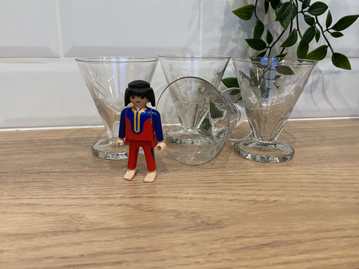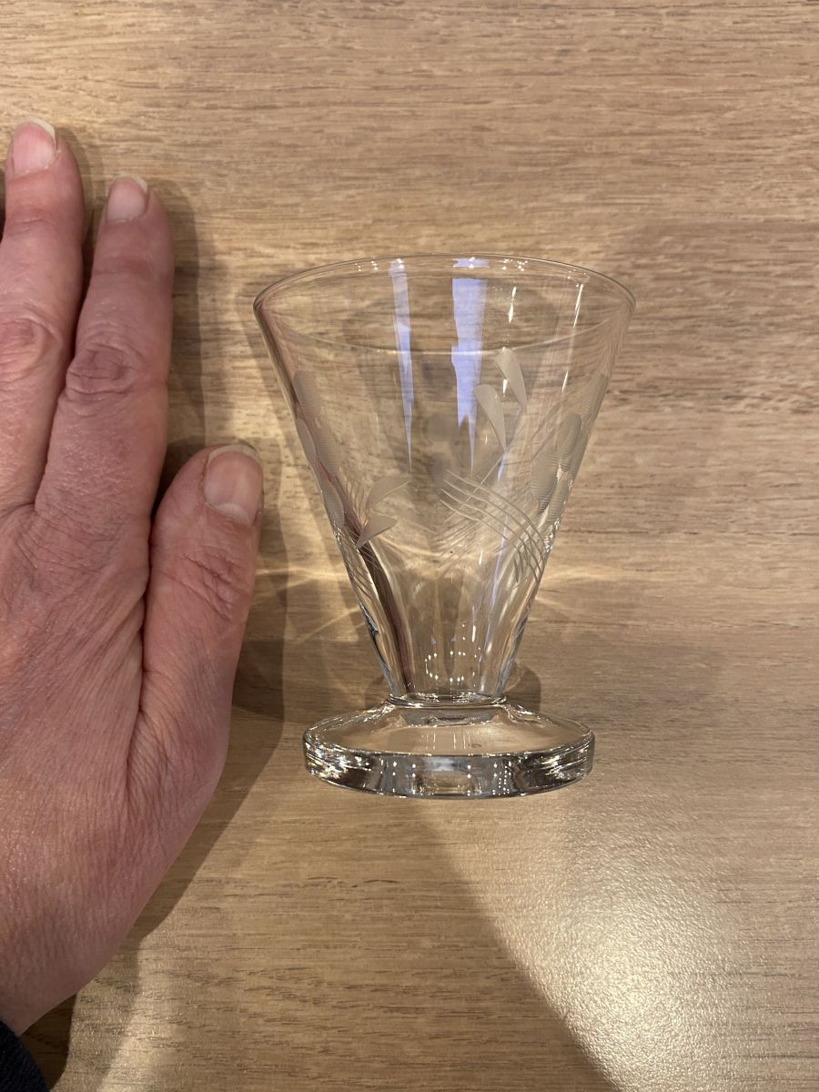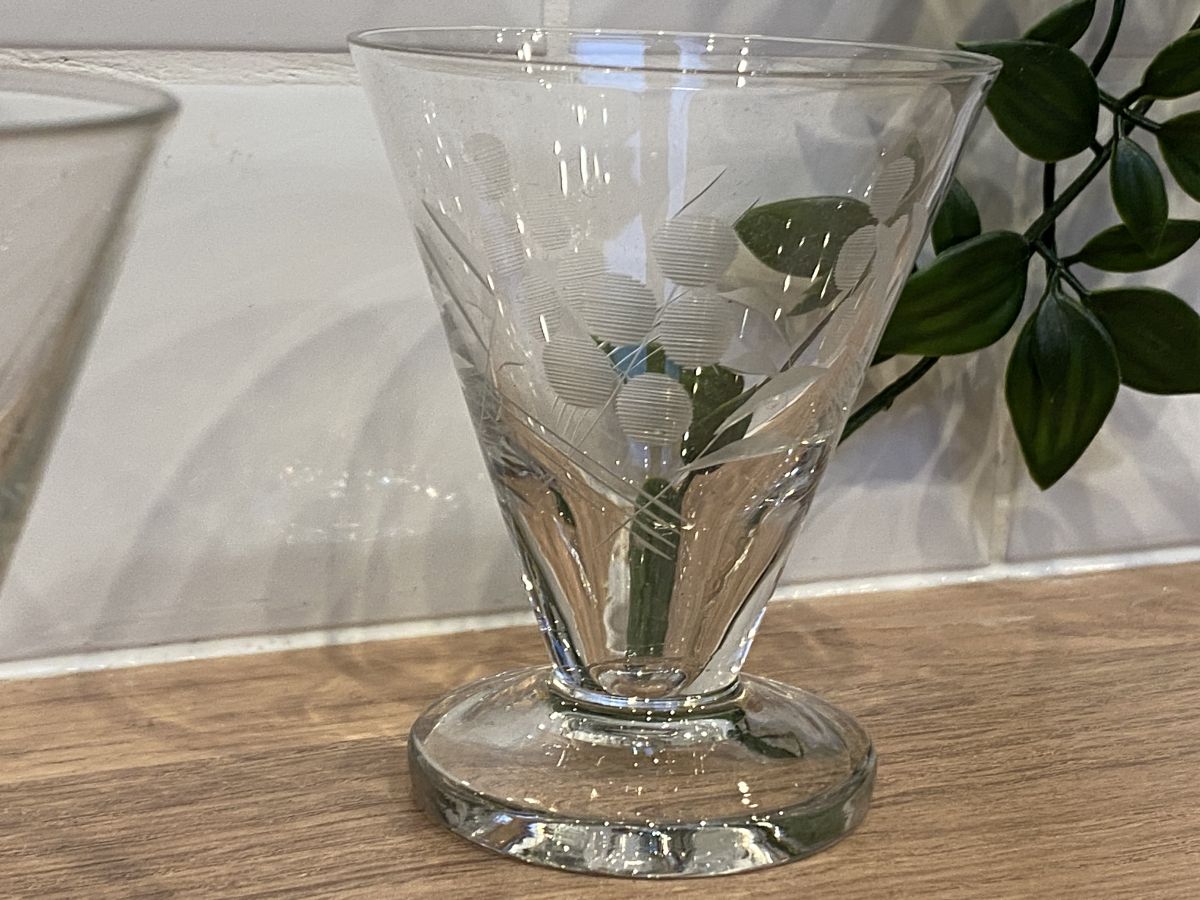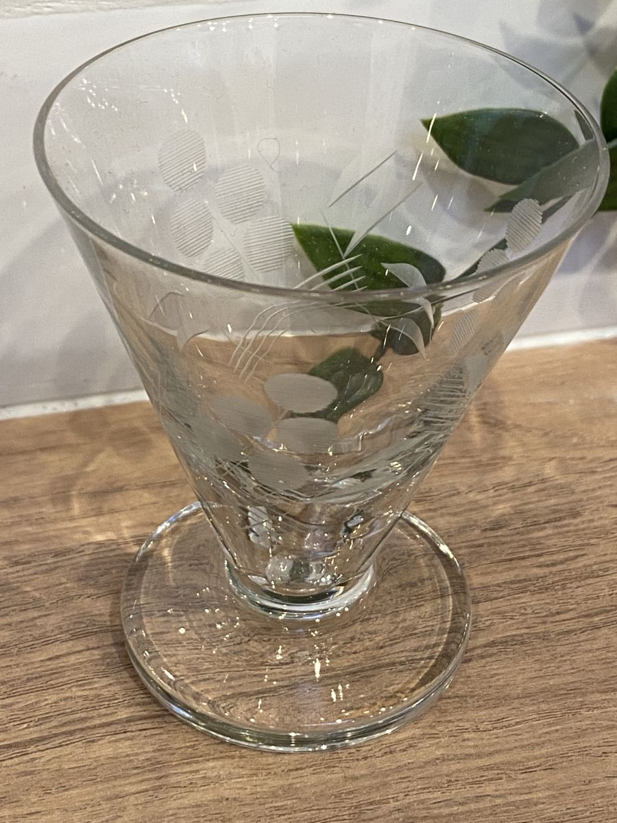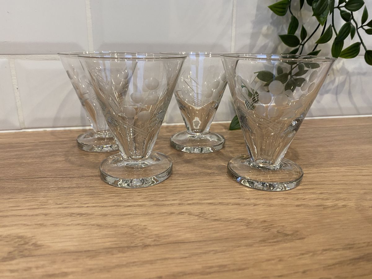 Set de 4 verres à vin blanc en verre gravé, verres coniques des verreries Doyen Made in Belgium. Joli décor floral, bel état. Diamètre 7 cm, hauteur 8,5 cm. V761bis