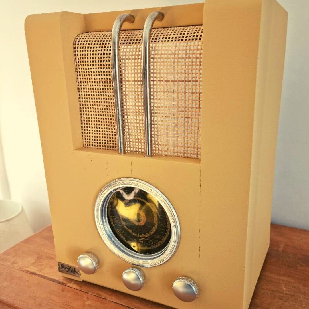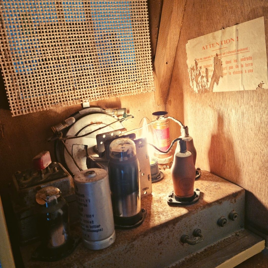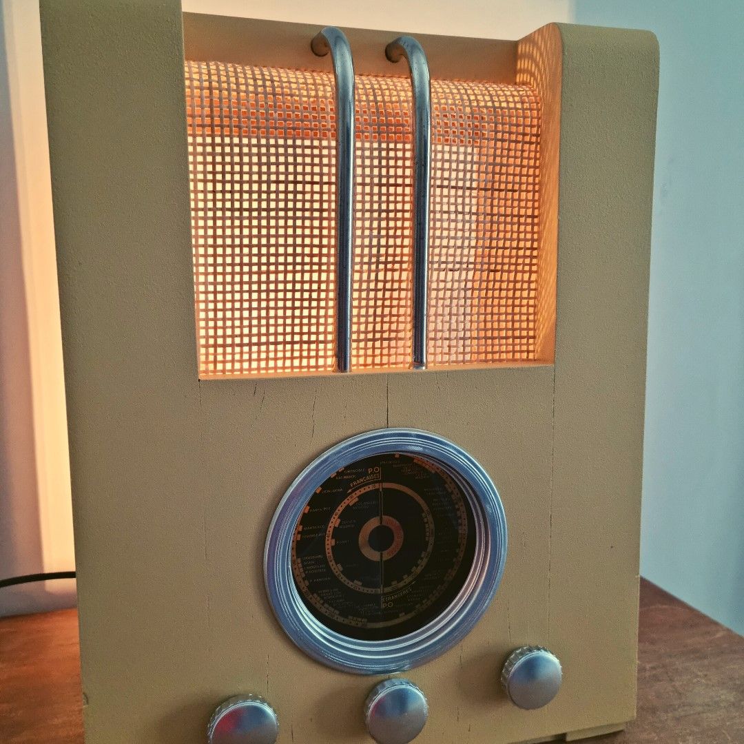Une radio datant d'avant 1940 upcyclée en lampe d'ambiance.
