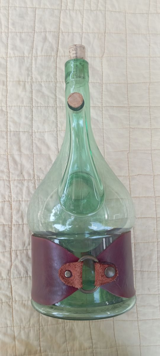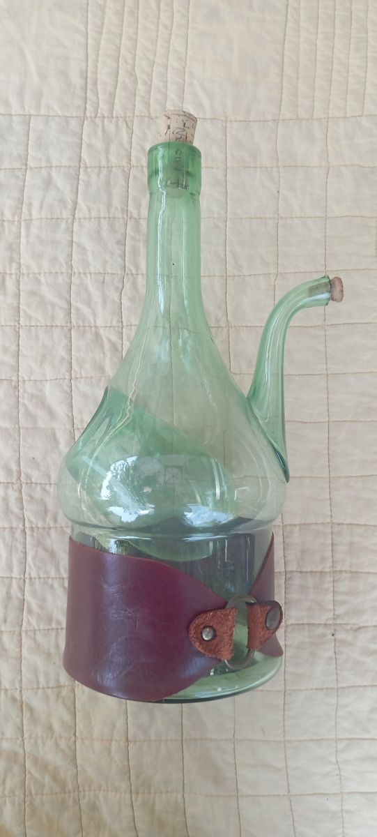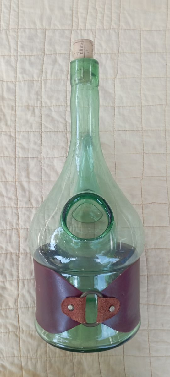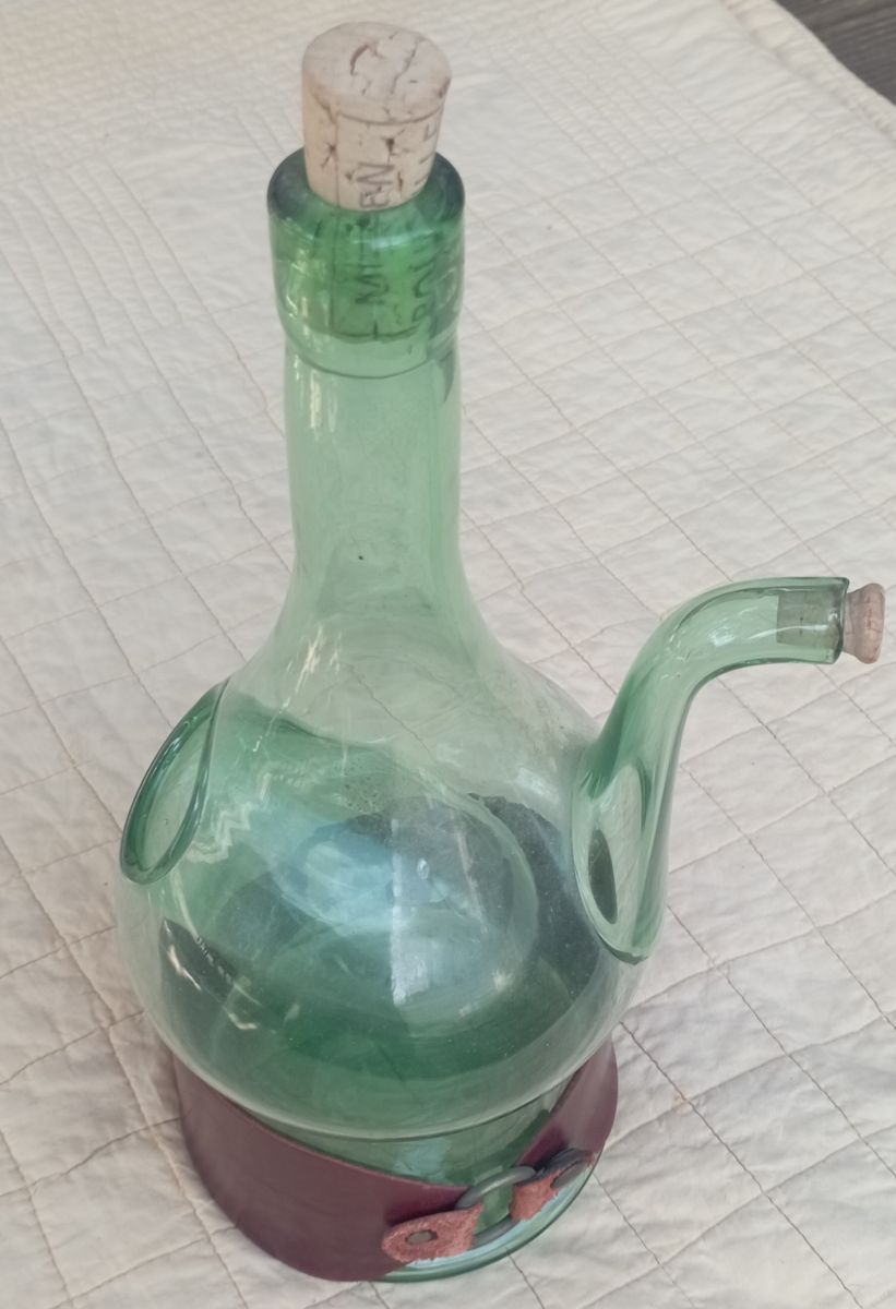 Carafe Chianti en verre vert soufflé à la main, Italie, années 1960, refroidisseur. Goulot et bec verseur avec son bouchon liège. Ceinture en cuir amovible fermée par bouton pression.