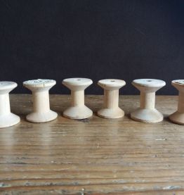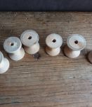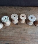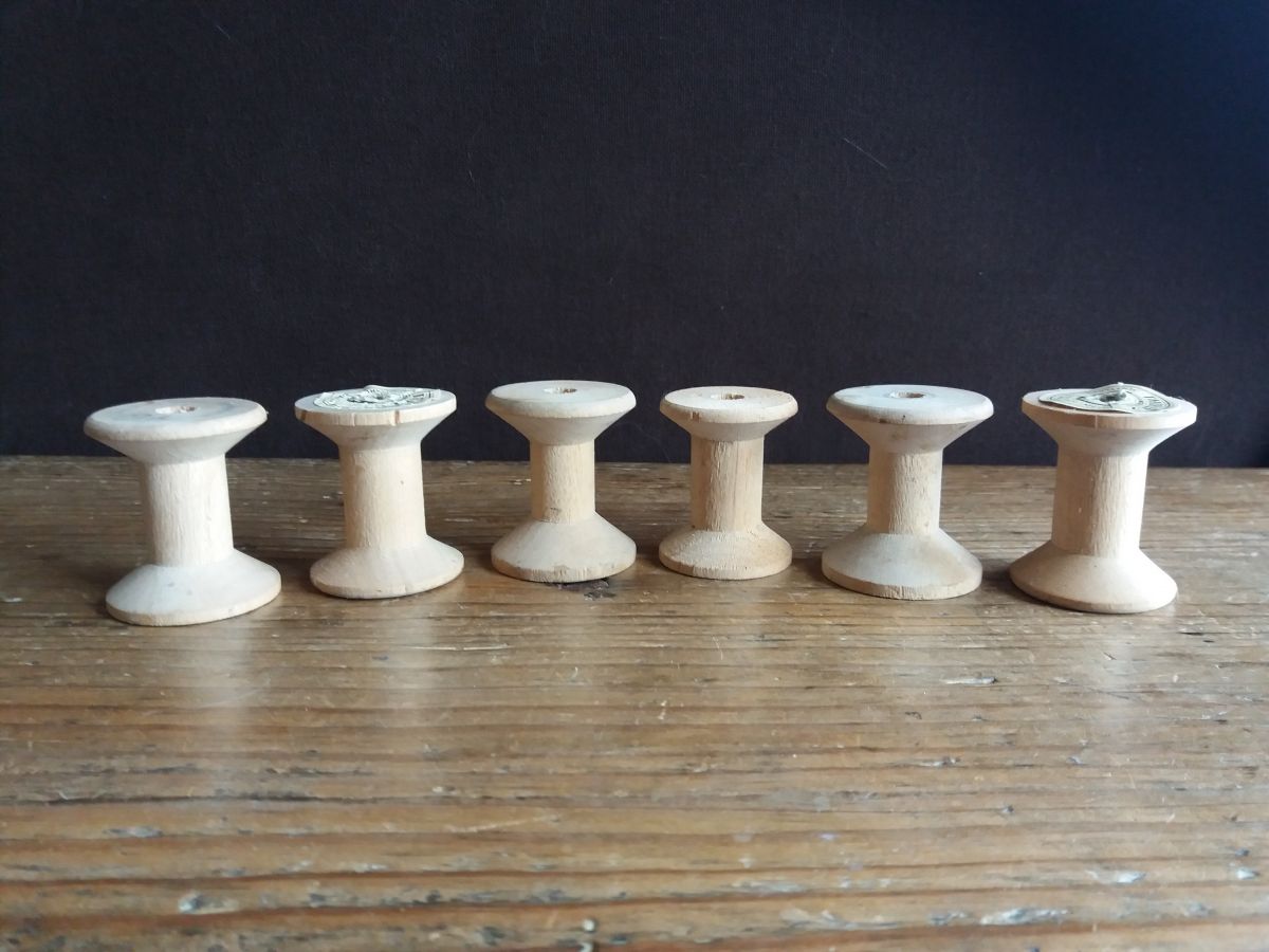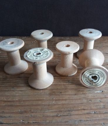 Lot de 6 charmantes bobines de fil anciennes en bois, dont deux comportent une étiquette indiquant « Thiriez Lille Made in France 500 yards, 457 mètres ». Elles ne sont pas strictement identiques, mais pas loin, l’une mesure 1 ou 2 mm de moins de hauteur et de diamètre et quatre ont l’arête du haut plus chanfreinée que les autres. Elles datent d’avant les années 60 car en 1961 la société Thiriez fusionne avec la société "Dollfus-Mieg et Compagnie" et change donc de nom pour le célèbre nom DMC. Elles sont en bon état mais ne cachent pas quelques marques, taches, et tout petits éclats qui témoignent de leur âge. Les étiquettes aussi portent les stigmates du temps et de l’usage, abîmées et se décollent. Elles mesurent 4,5 cm de hauteur et 3,6 cm de diamètre.