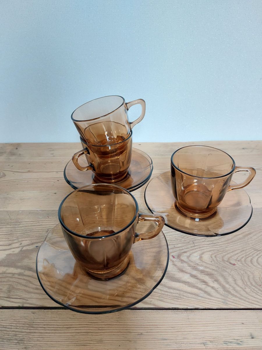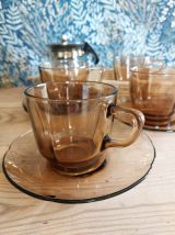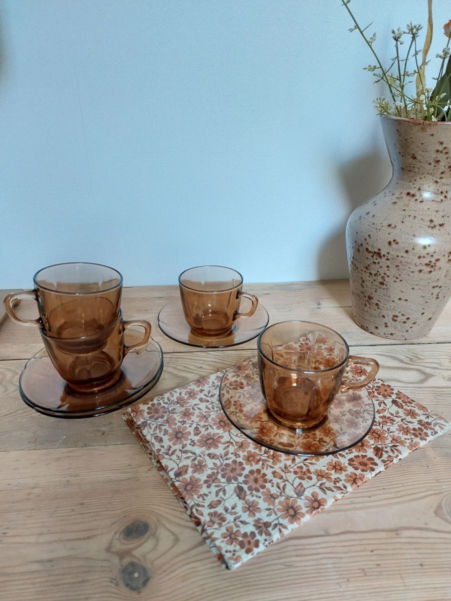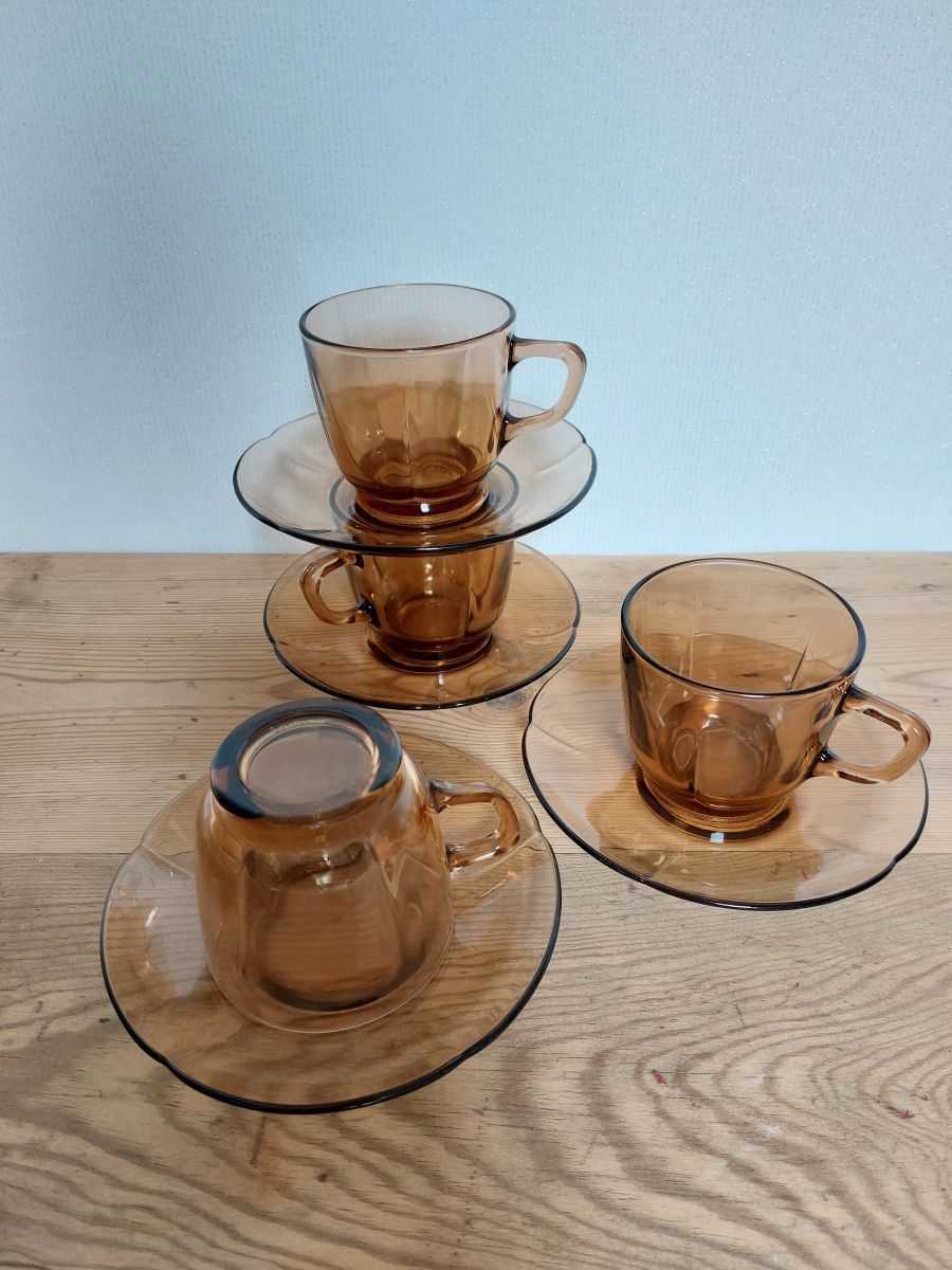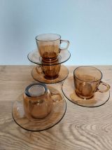 4 Tasses avec sous-tasses à café brun fumé années 70