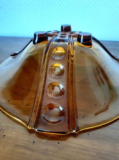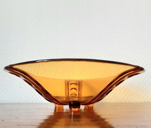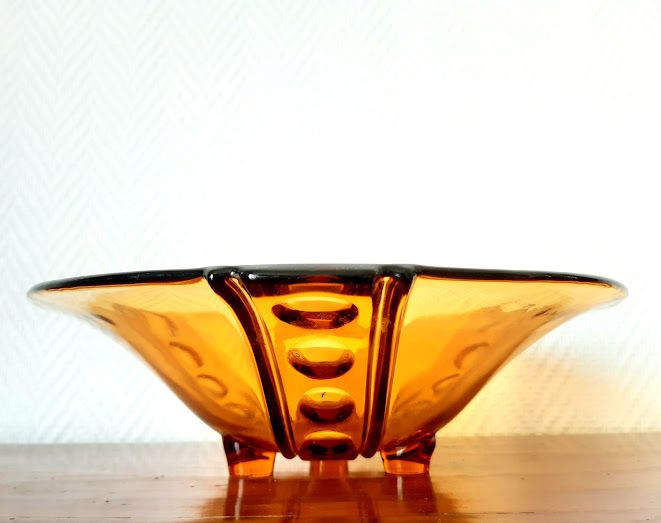 Coupe à fruits de couleur ambré ronde, reposant trois pieds ronds, à motifs de trois frises à motifs géométriques.