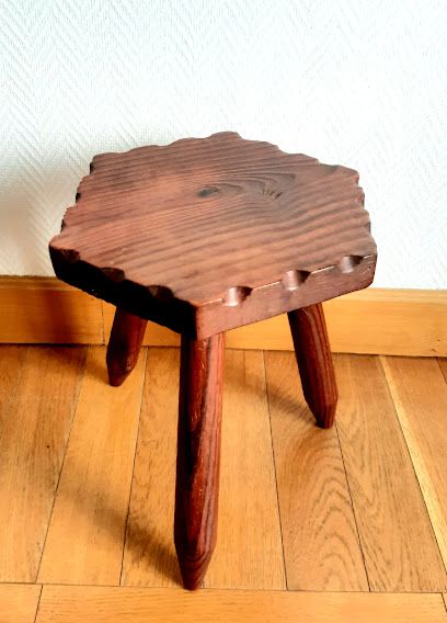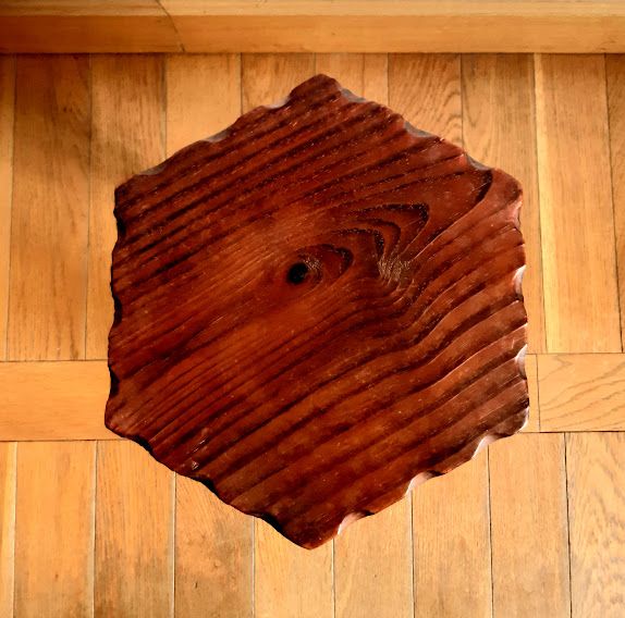 Tabouret en bois, assise hexagonale, tabouret travaillé dans le style brutaliste avec creux en bordure de l'assise , pieds lisses crayons. Objet déco par excellence, se mue parfaitement en un porte plante simple et original.