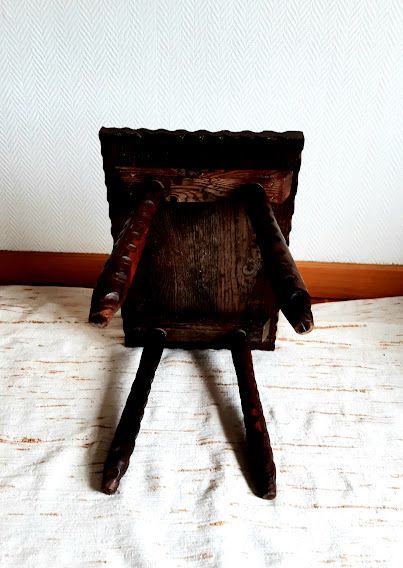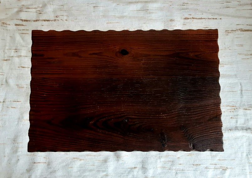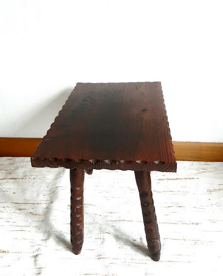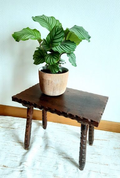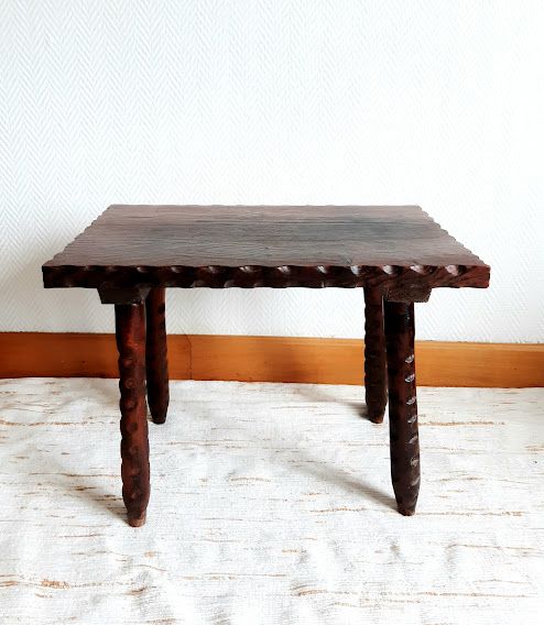 Table basse rectangulaire en bois de forme rectangulaire, travaillée dans le style brutaliste avec creux en bordure du plateaux et sur les quatre pieds de forme crayon.