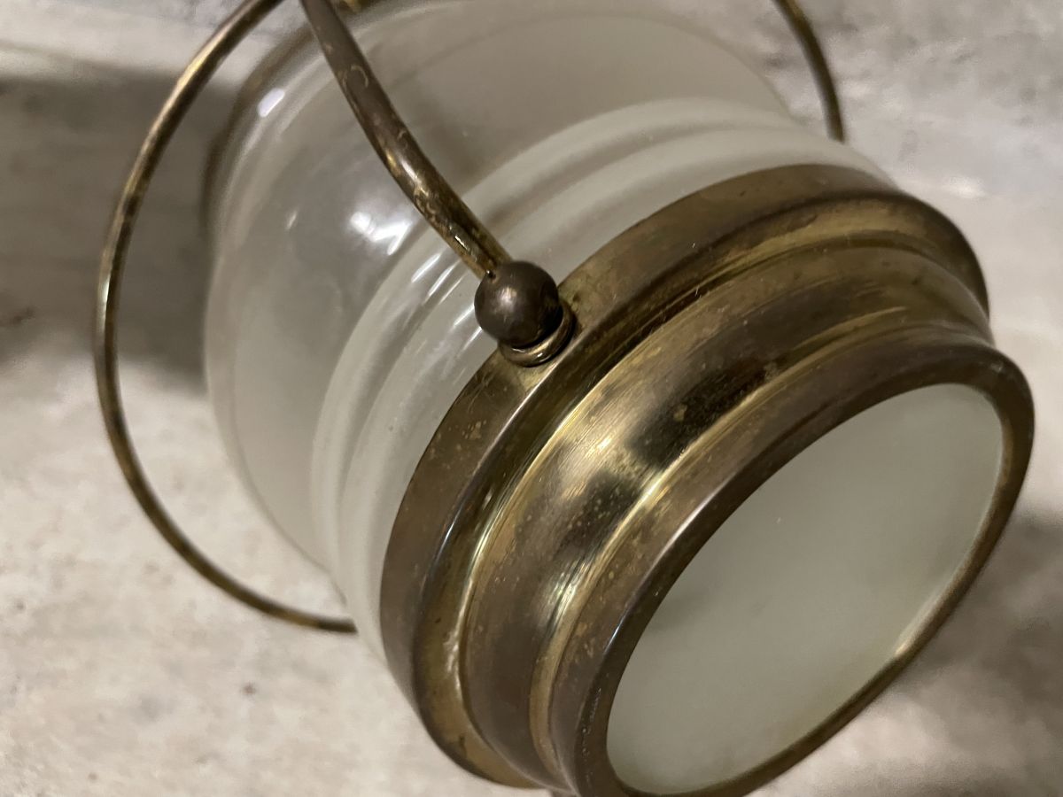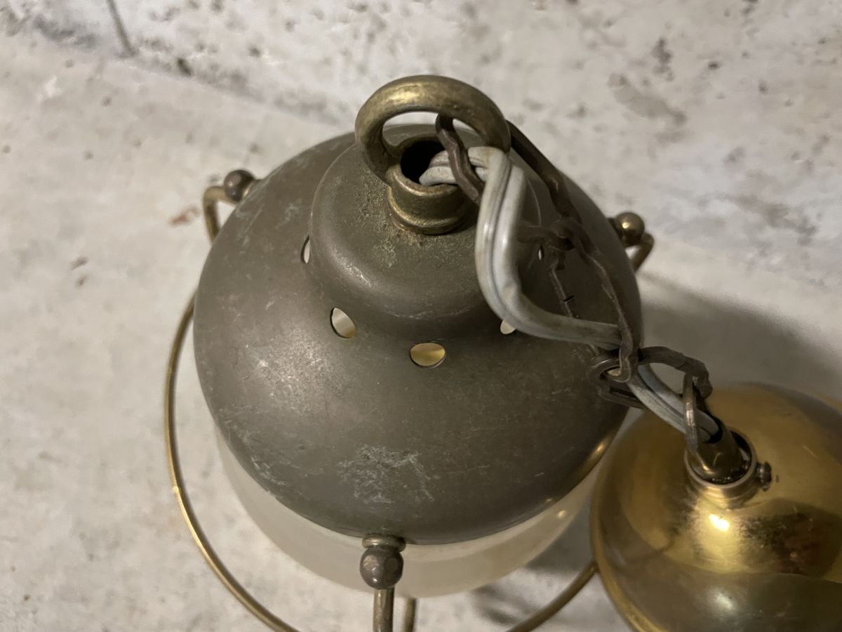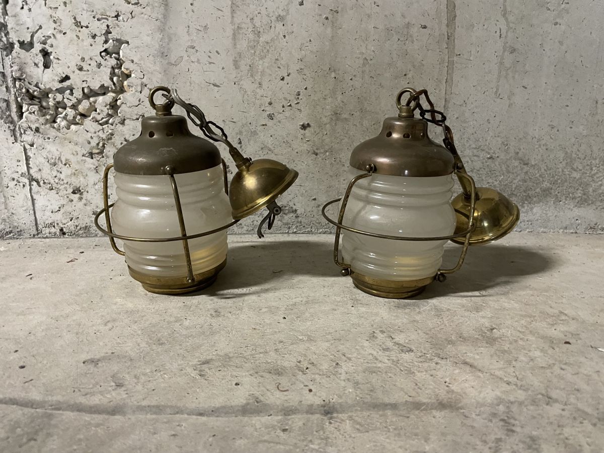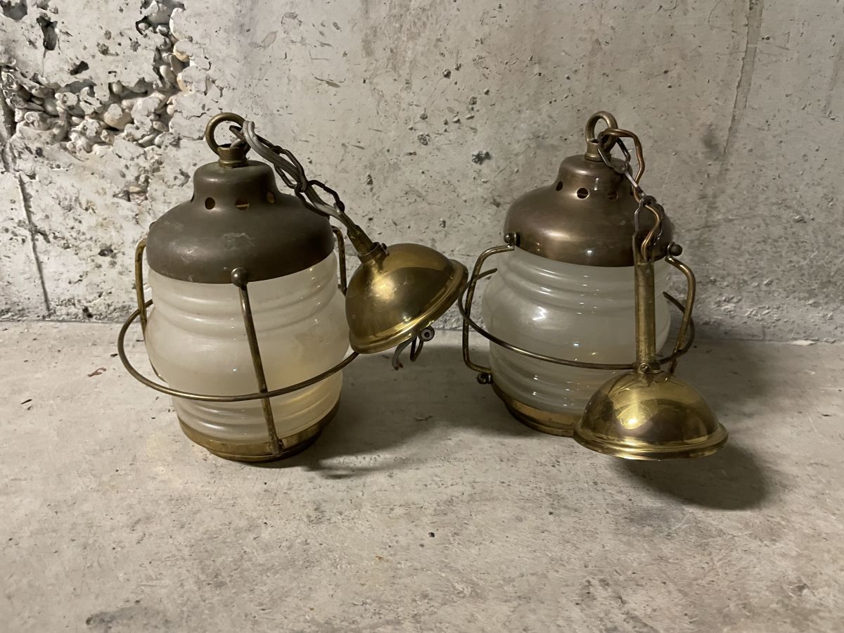 Paire de suspensions de marine en opaline, montant de douille en laiton, fonctionne parfaitement (ampoule vissée type E14), diamètre 12cm, hauteur 20cm, bon état général.