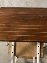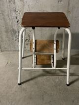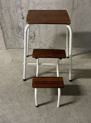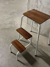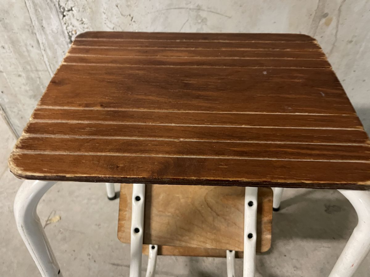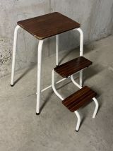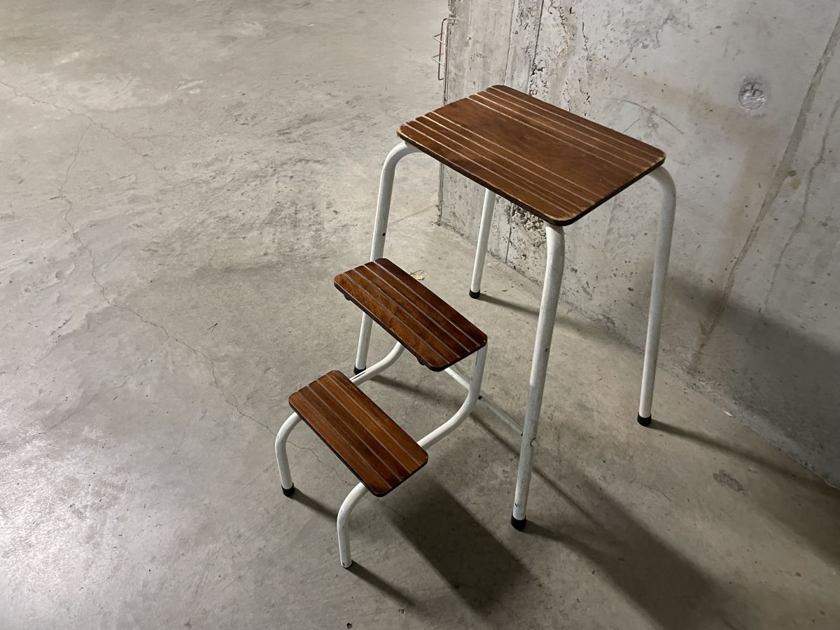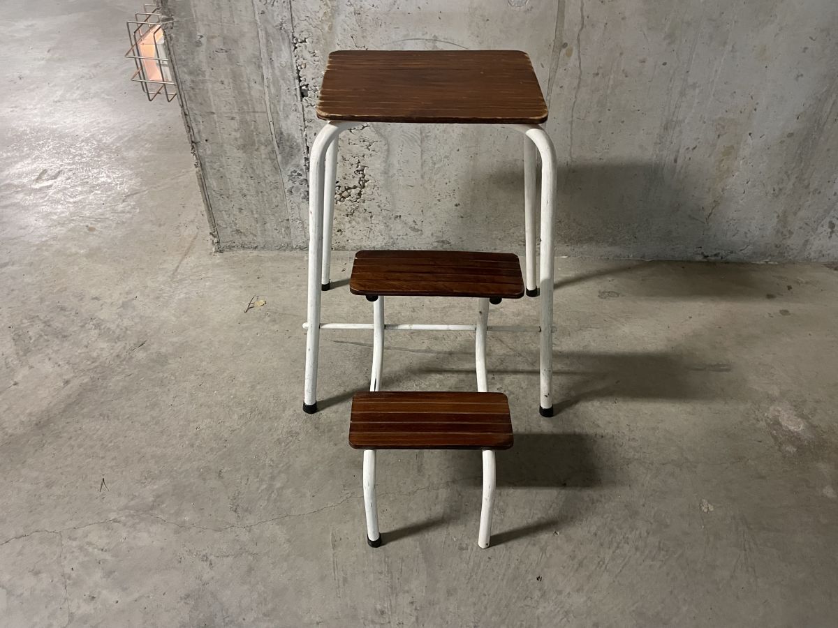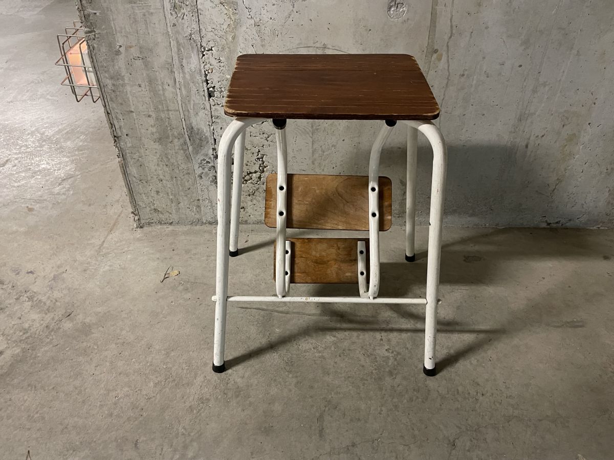 Tabouret marche-pied / escabeau des années 70 en métal blanc et bois, plateau du dessus 33x25cm, marches escamotables, manque un cache en plastique sur l’un des pieds des marches, traces d’usage (voir photos), dimensions (cm) : L.51xH.48xP.38, bon état général.