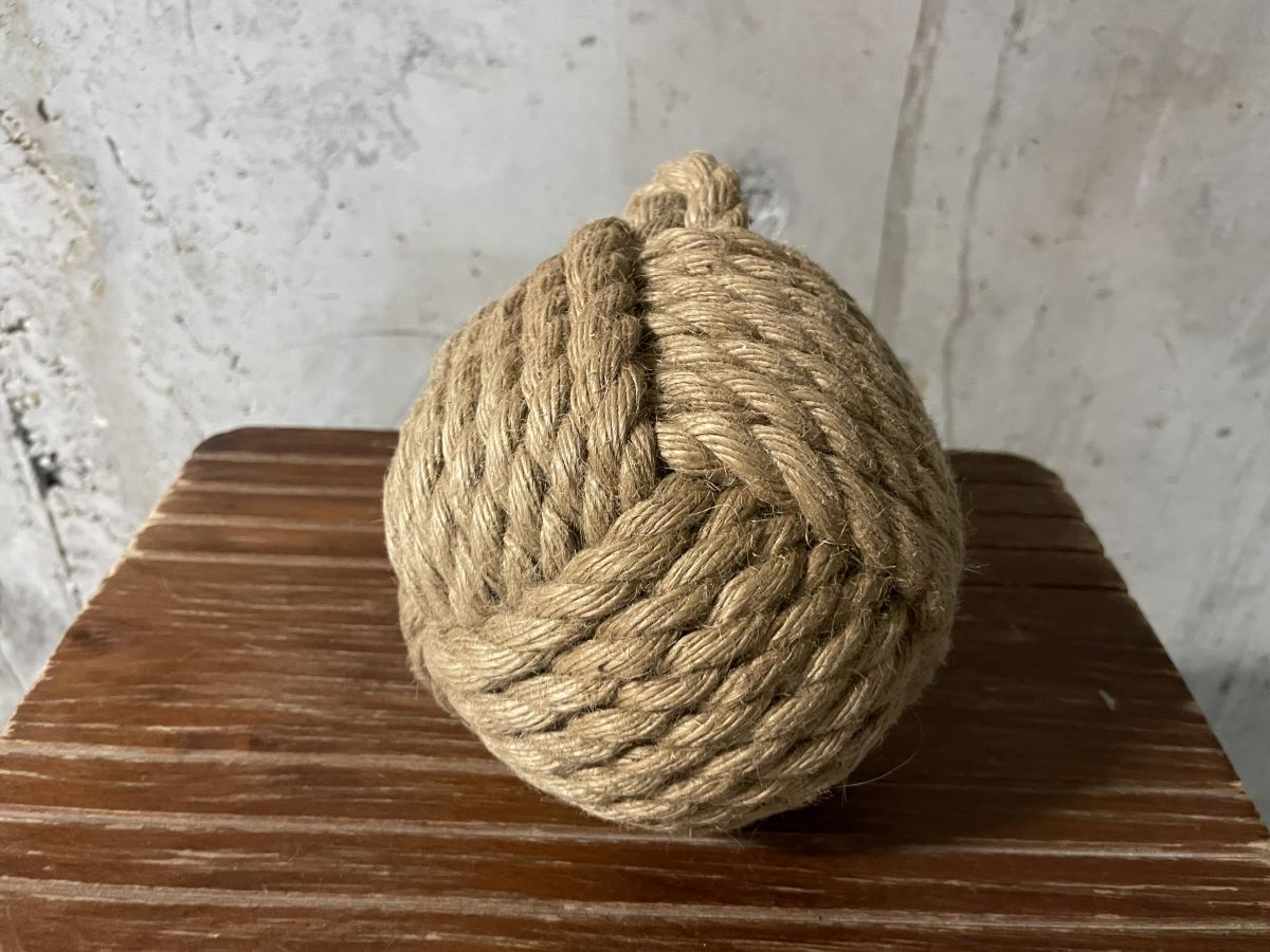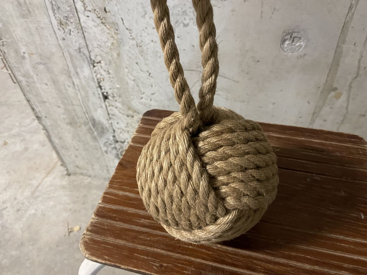 Boule d’amarrage en corde des années 60, diamètre 13cm, bon état.