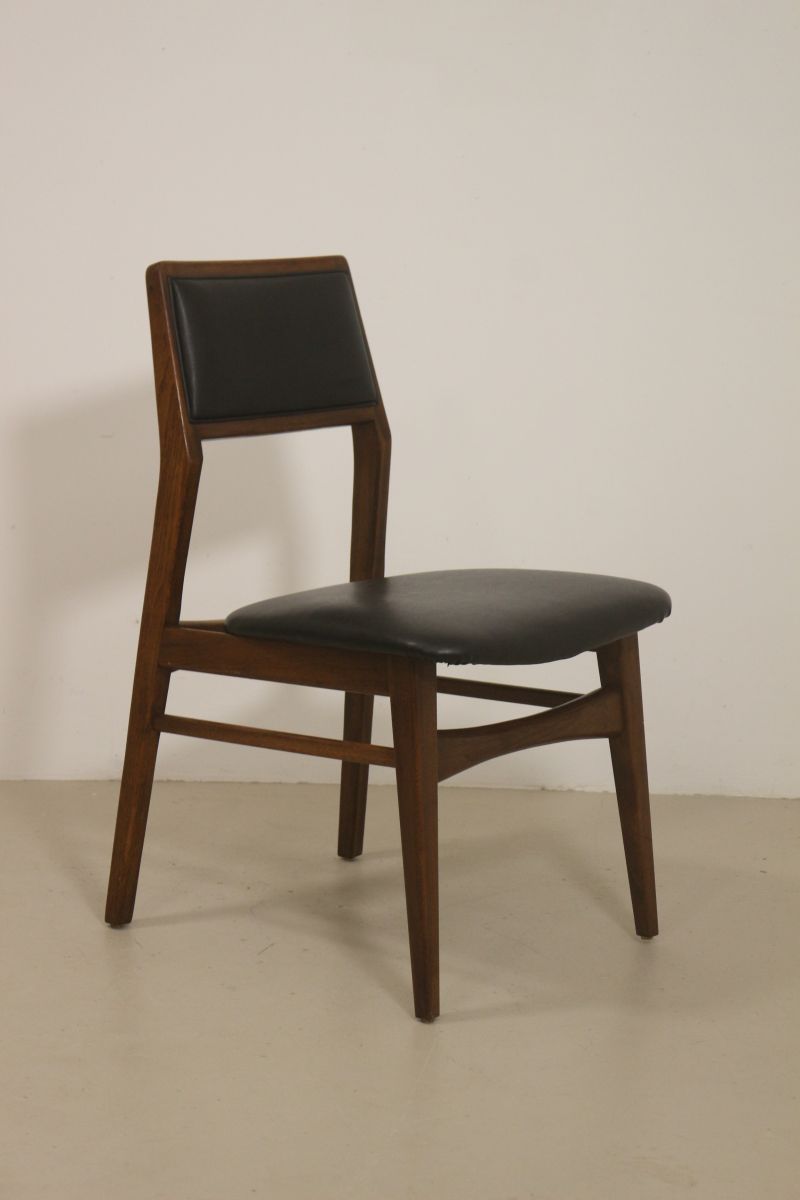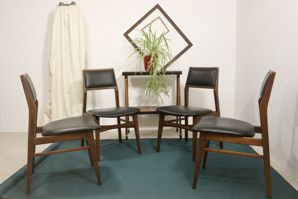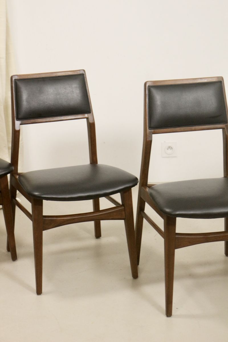 Set de 4 de chaises de salle à manger en noyer sculpté par Foster McDavid vers les années 1970 produit américain revêtement en similicuir noir d'origine tous en très bonne état sauf le dossier d’une chaise ou se trouve un mini accident (voir photo).La structure est en bois de noyer solide et épais. L'ensemble offre une belle allure autour d'une table de salle à manger.