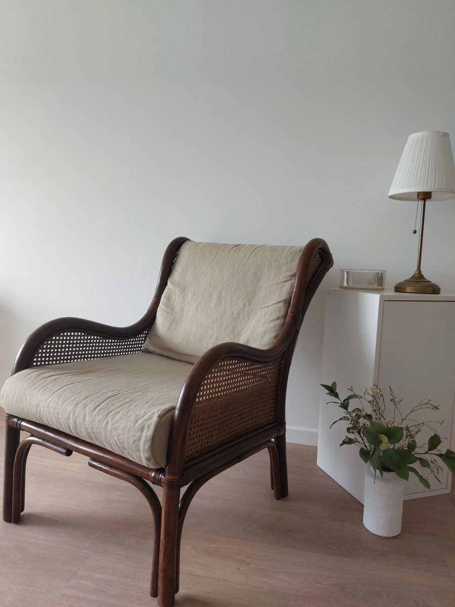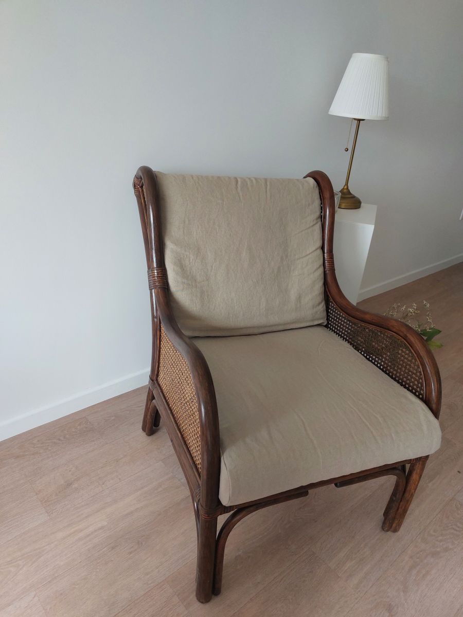 Joli fauteuil en rotin et canage avec assise et dossier en lin