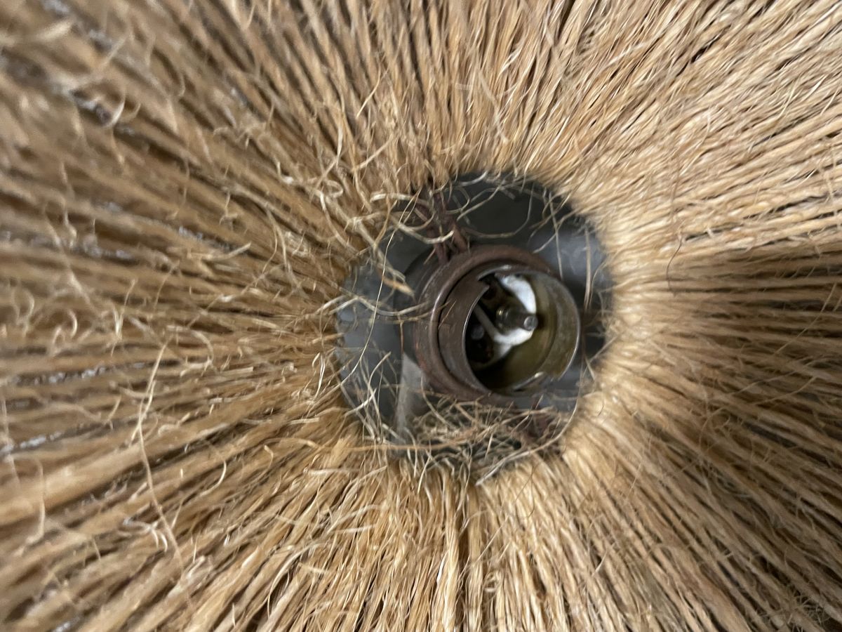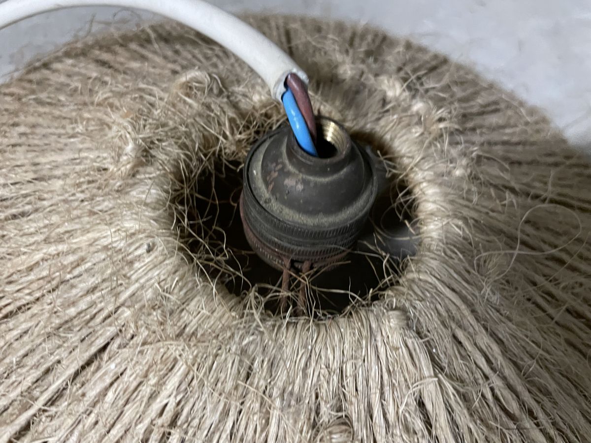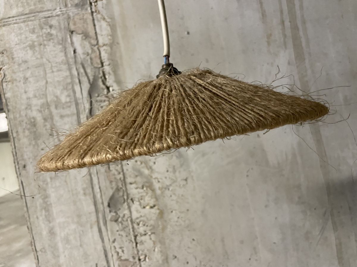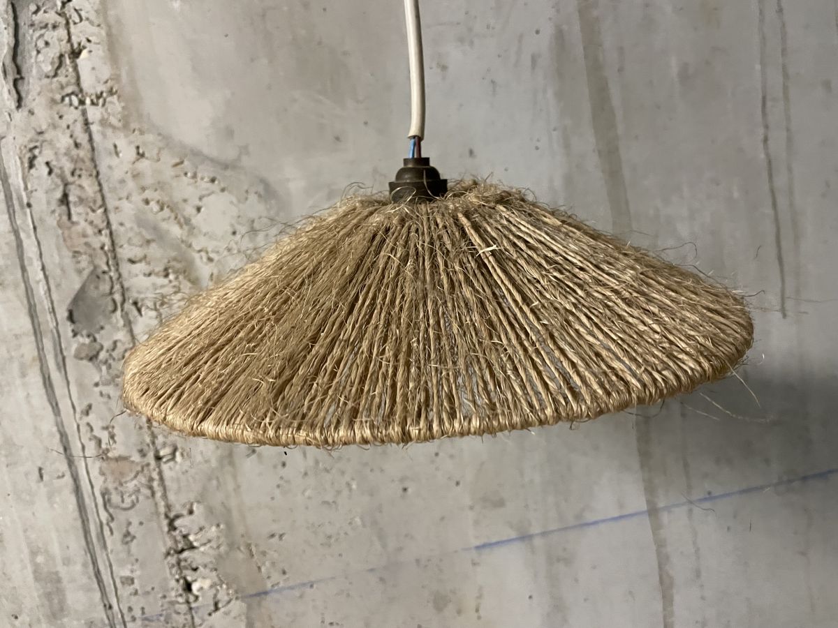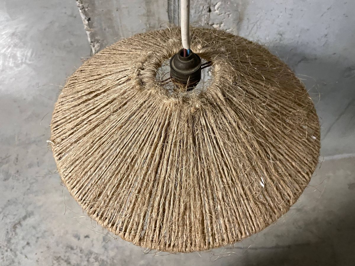 Suspension en corde des années 60, ampoule baïonnette, à ré-électrifier (ne fonctionne pas en l’état mais très simple de changer le système de douille, diamètre 30cm, hauteur 8cm.