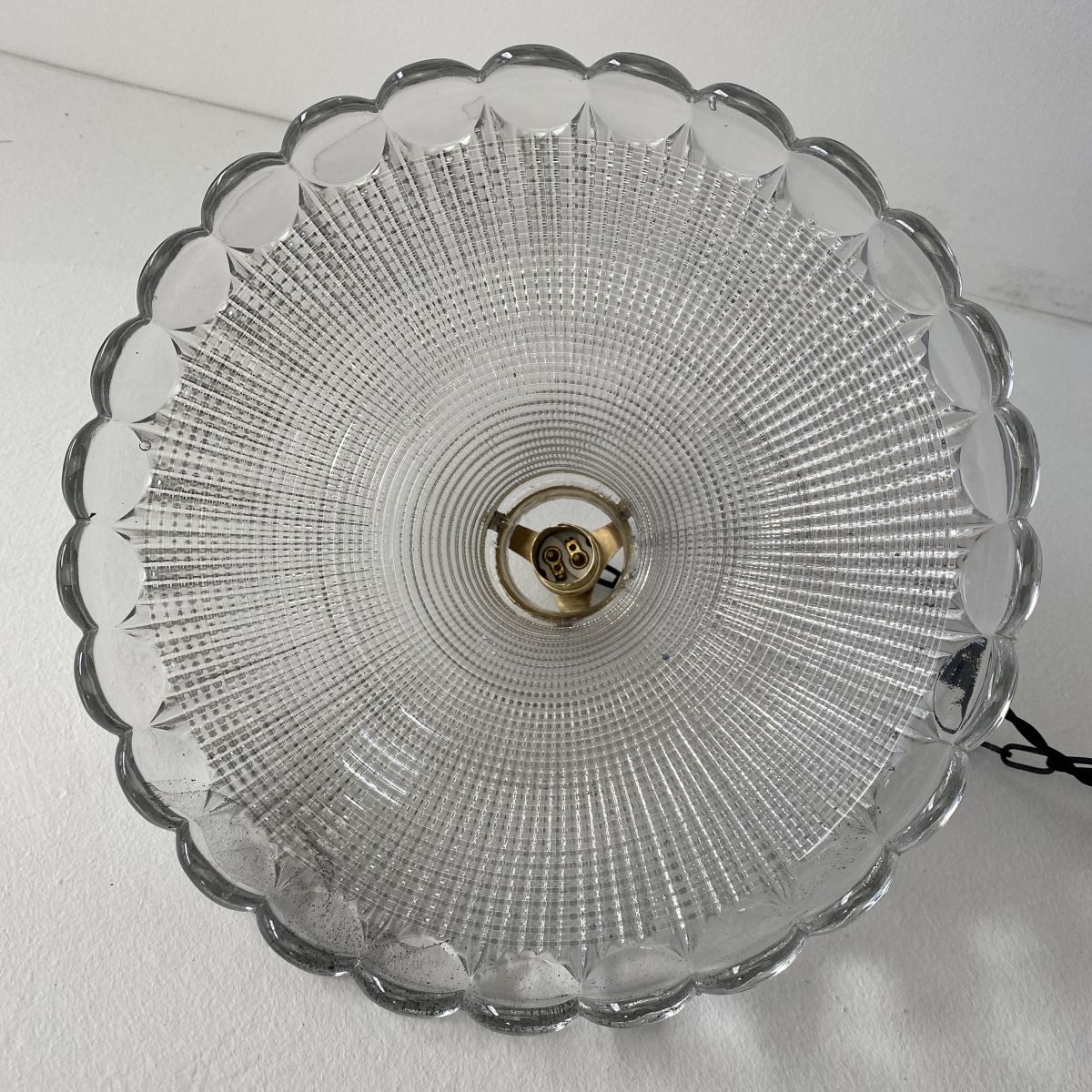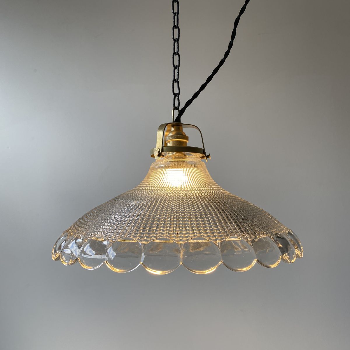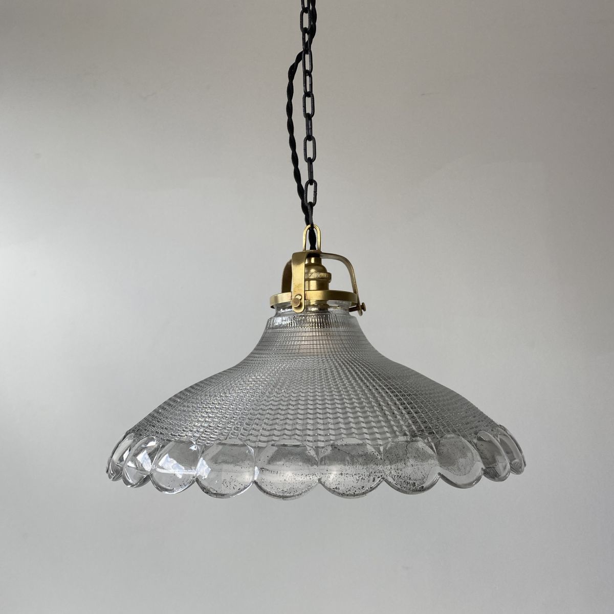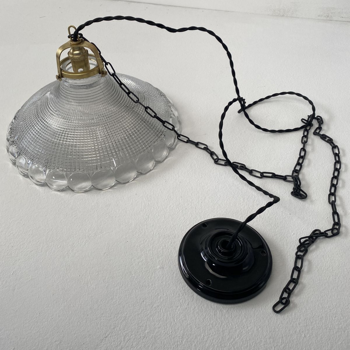 Ancienne suspension en verre prismatique. A noter, un fêle, qui ne remet pas en cause la solidité du verre. Chaîne de fixation et rosace en céramique.