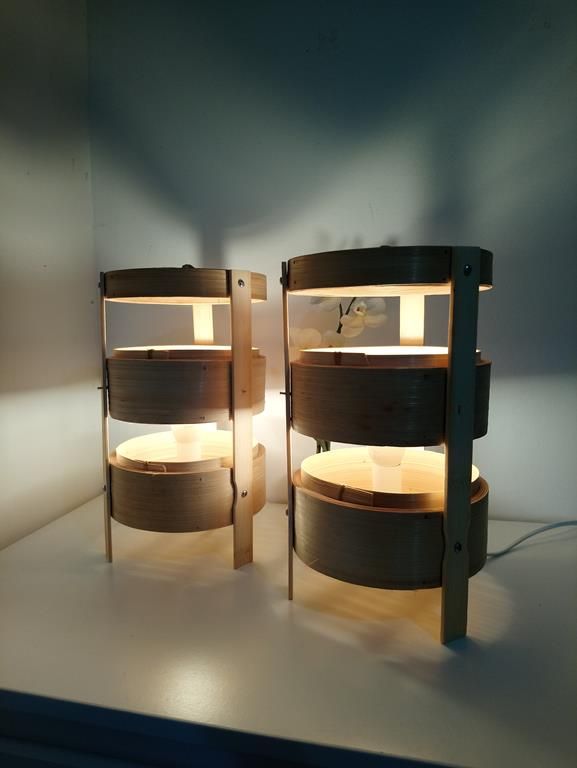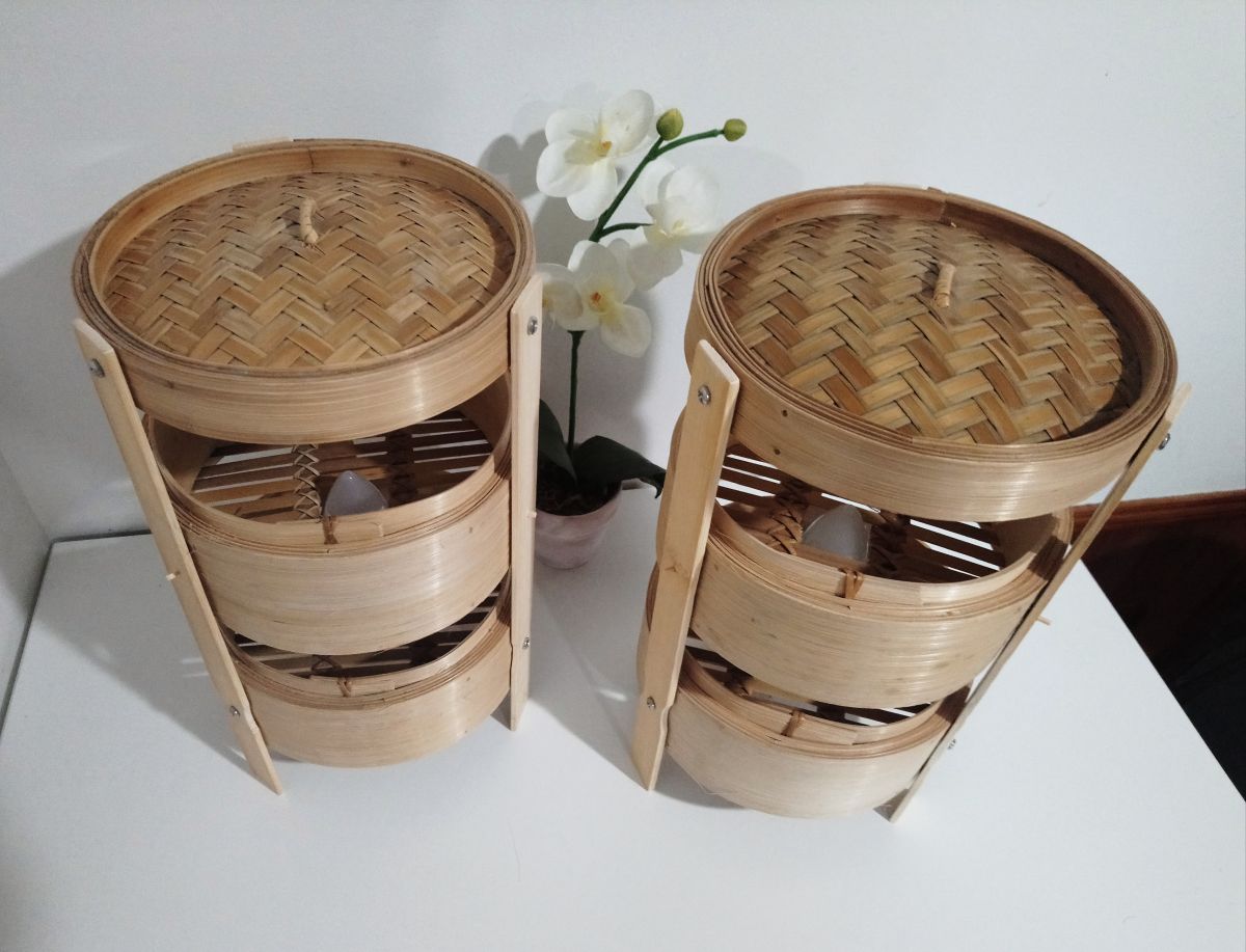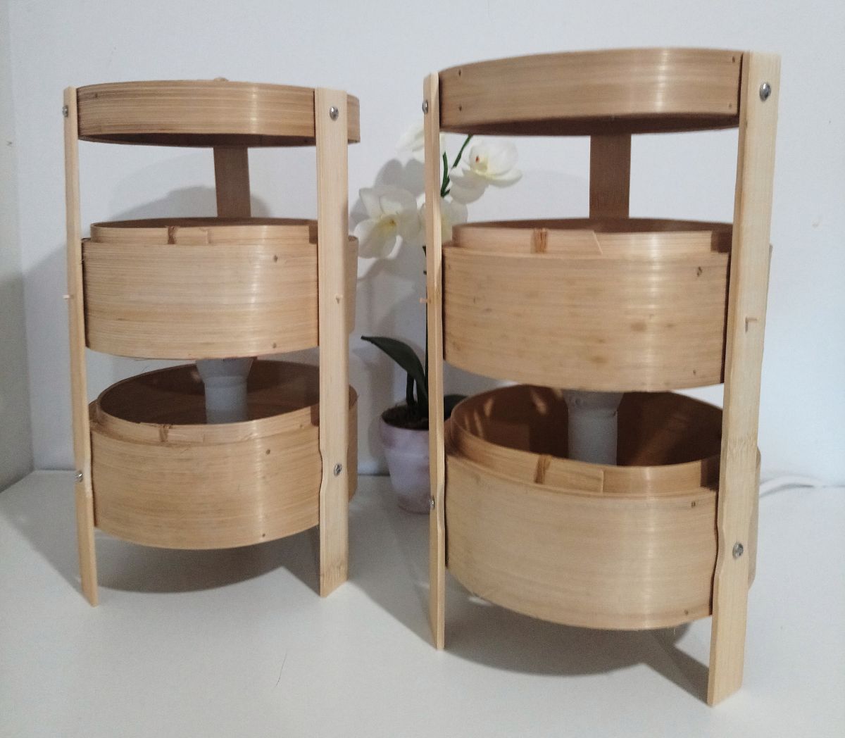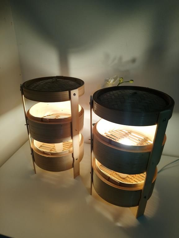 Conçues à partir de paniers de cuisson vapeur chinois. L' élément du milieu est amovible pour pouvoir changer l'ampoule.