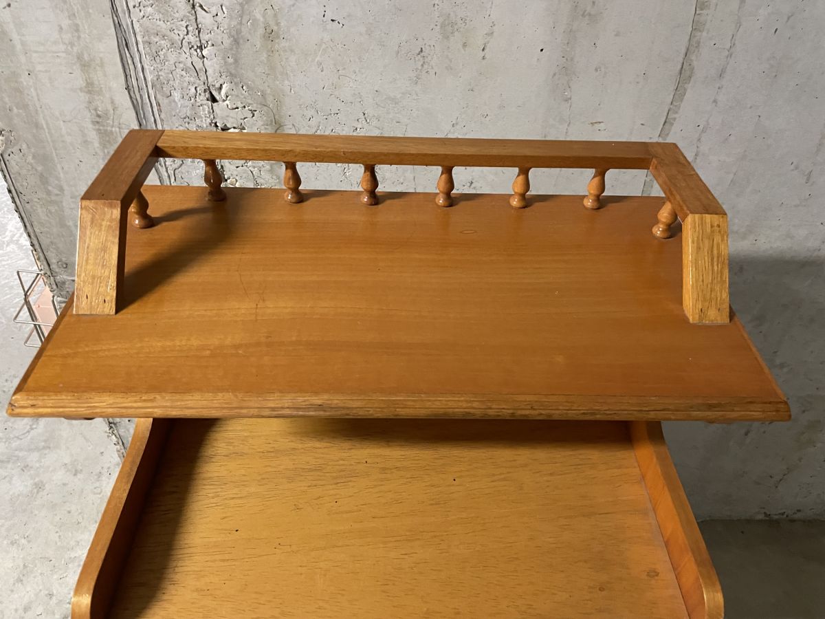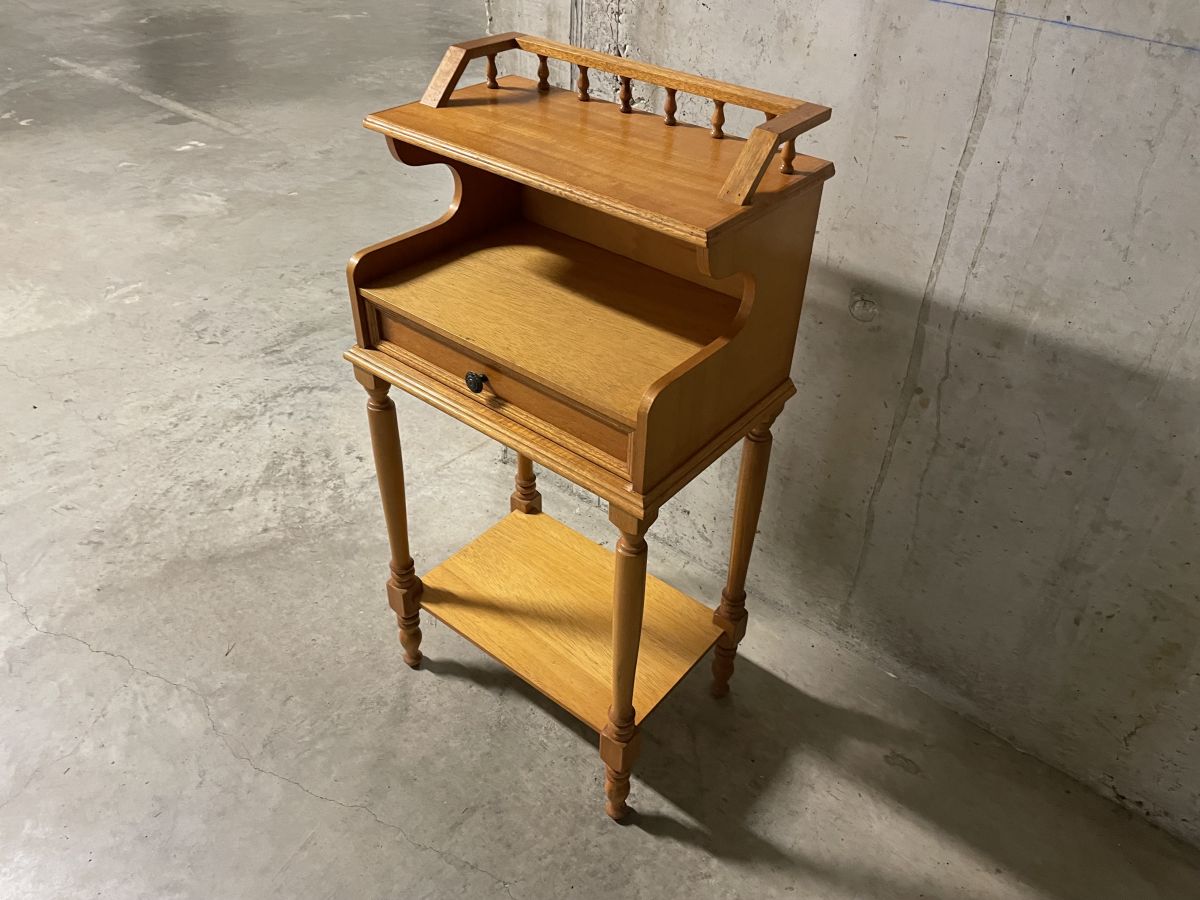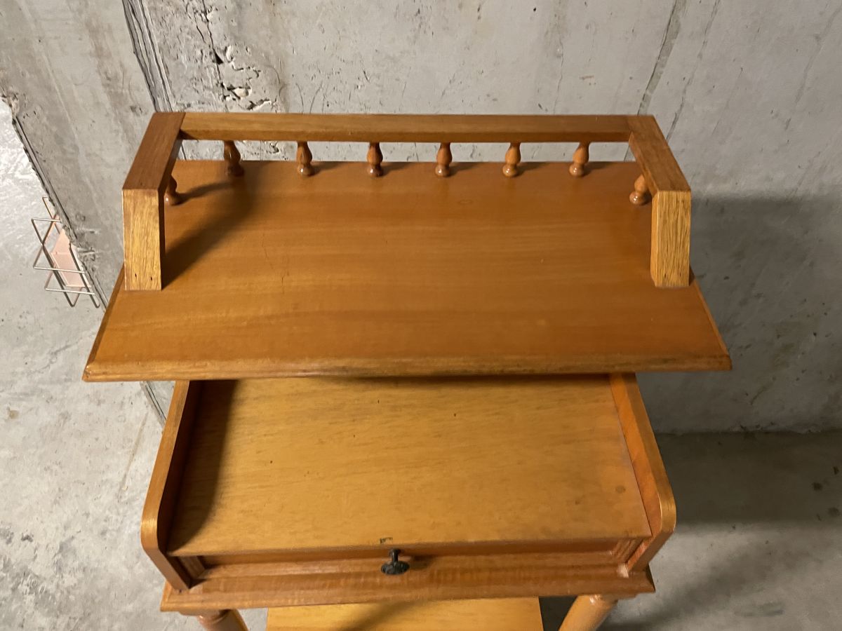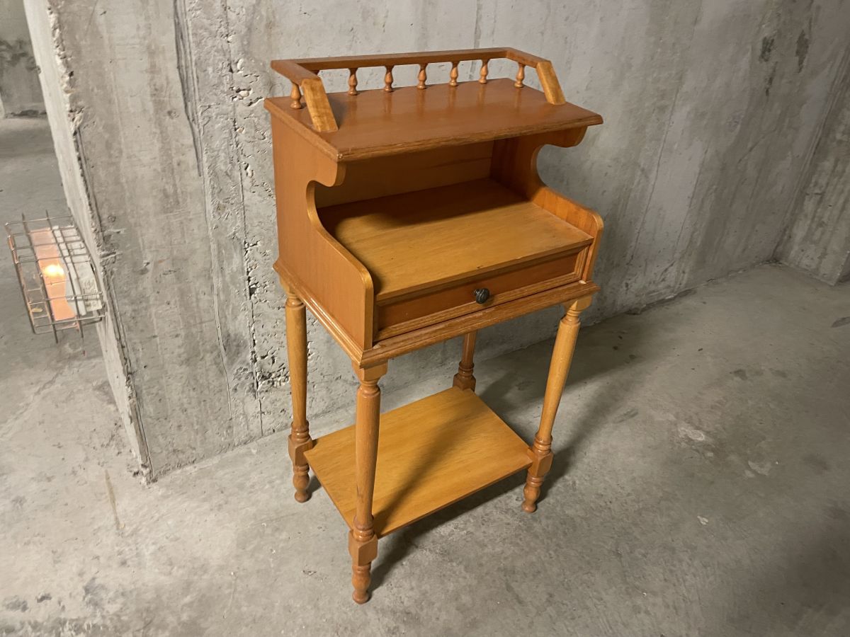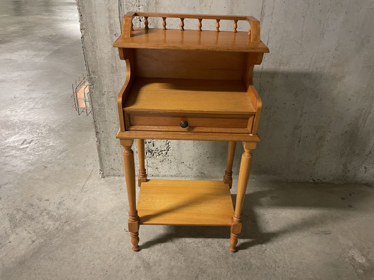 Meuble d’entrée en bois clair des années 60, 1 tiroir, dimensions (cm) : L.48xH.92xP.31, bon état.