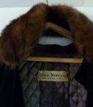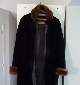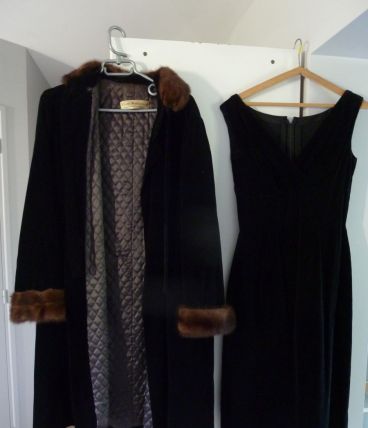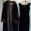 Ensemble Haute couture France Années 1960, E. Montigny. Robe et manteau velours lisse noir. Bords manches, et col manteau bordés véritable fourrure. Bon état mais prévoir un nettoyage.