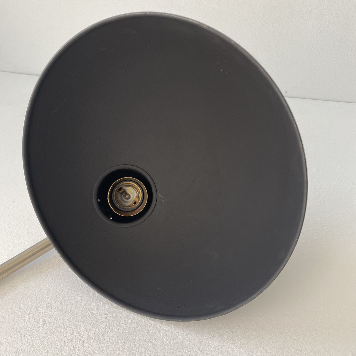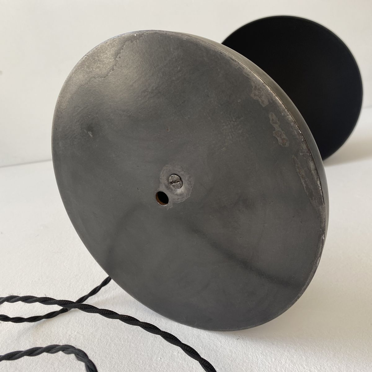 Entièrement restaurée. Poncée, cirée anthracite. L’intérieur de l’abat-jour a été repeint en noir avec de la peinture haute température.
