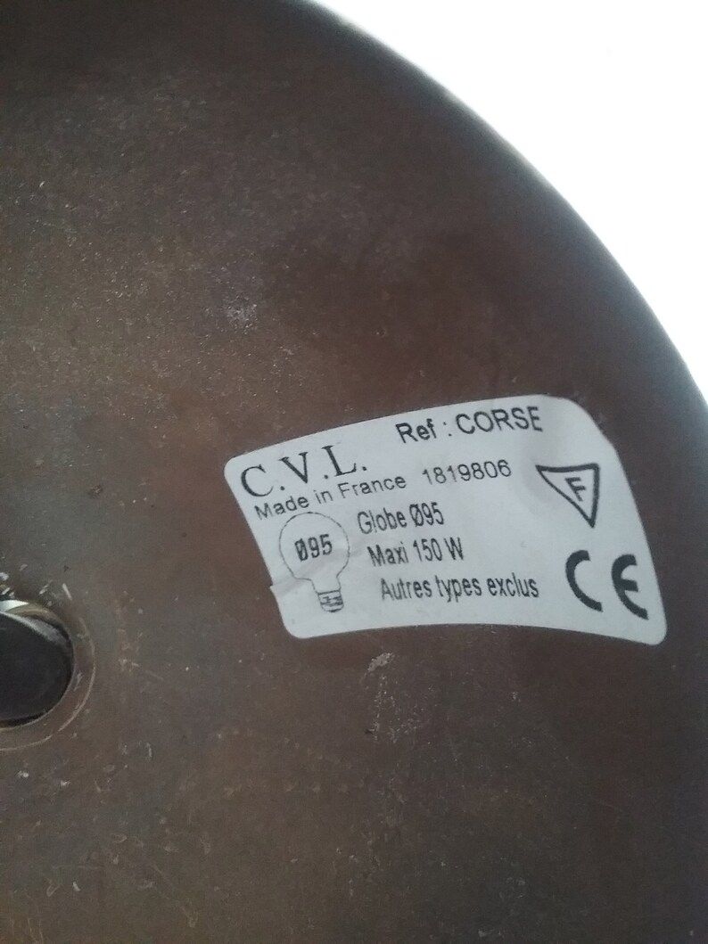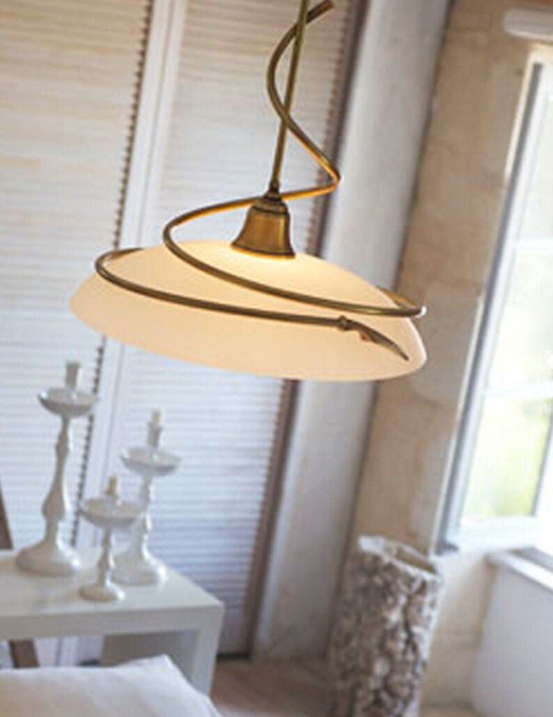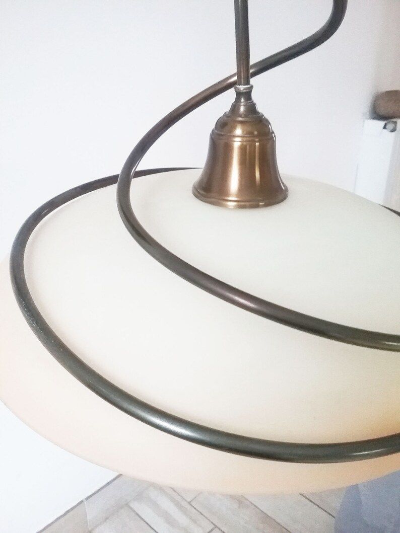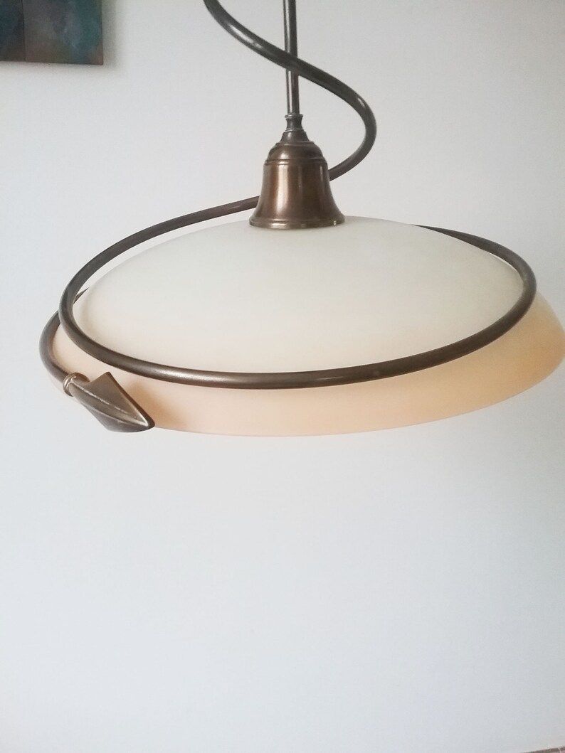 Le luminaire est en bon état. Il présente un petit éclat sur le verre, mais n'entrave en rien son utilisation. Le laiton de la suspension tourne autour du verre bruni et fini avec le design d'une flèche.