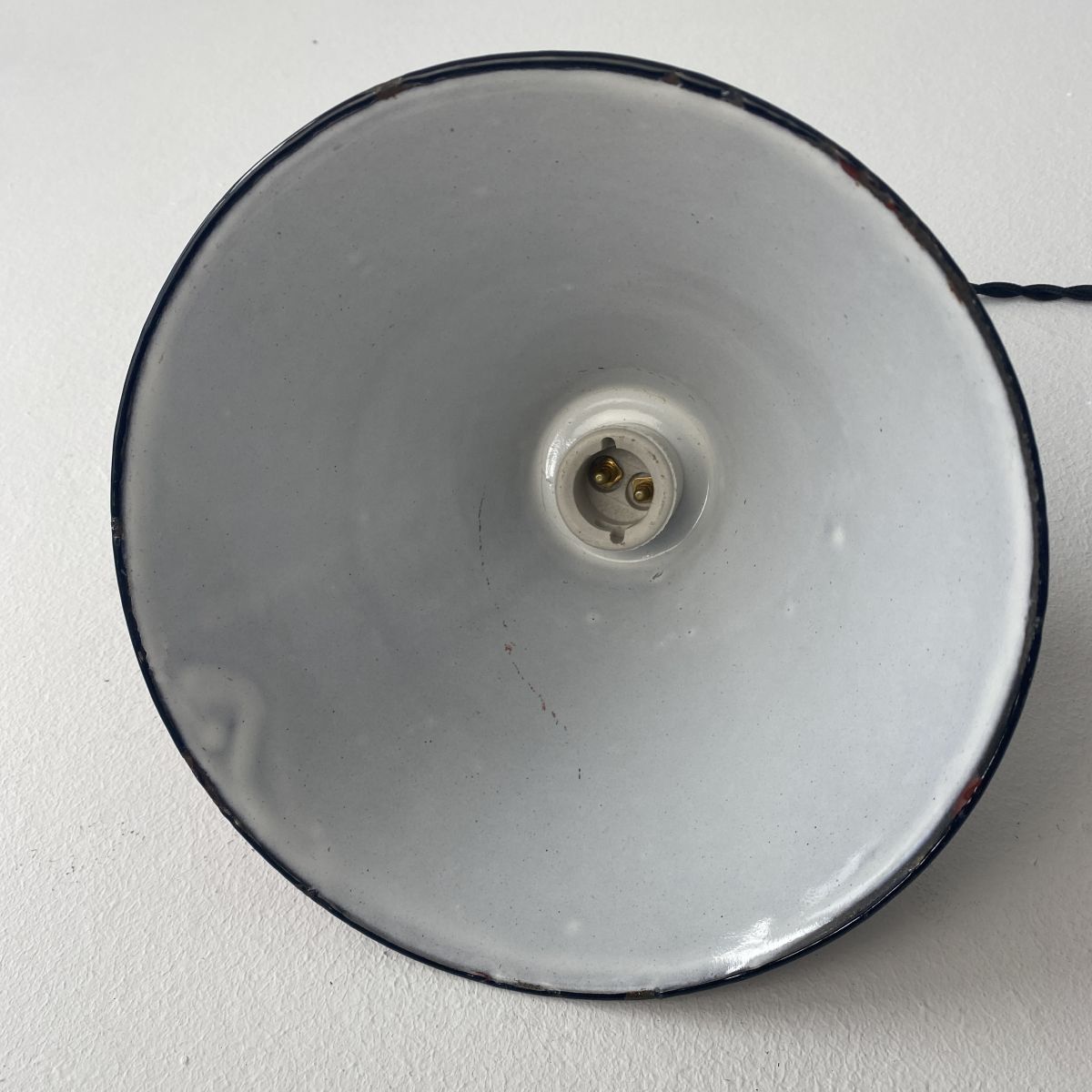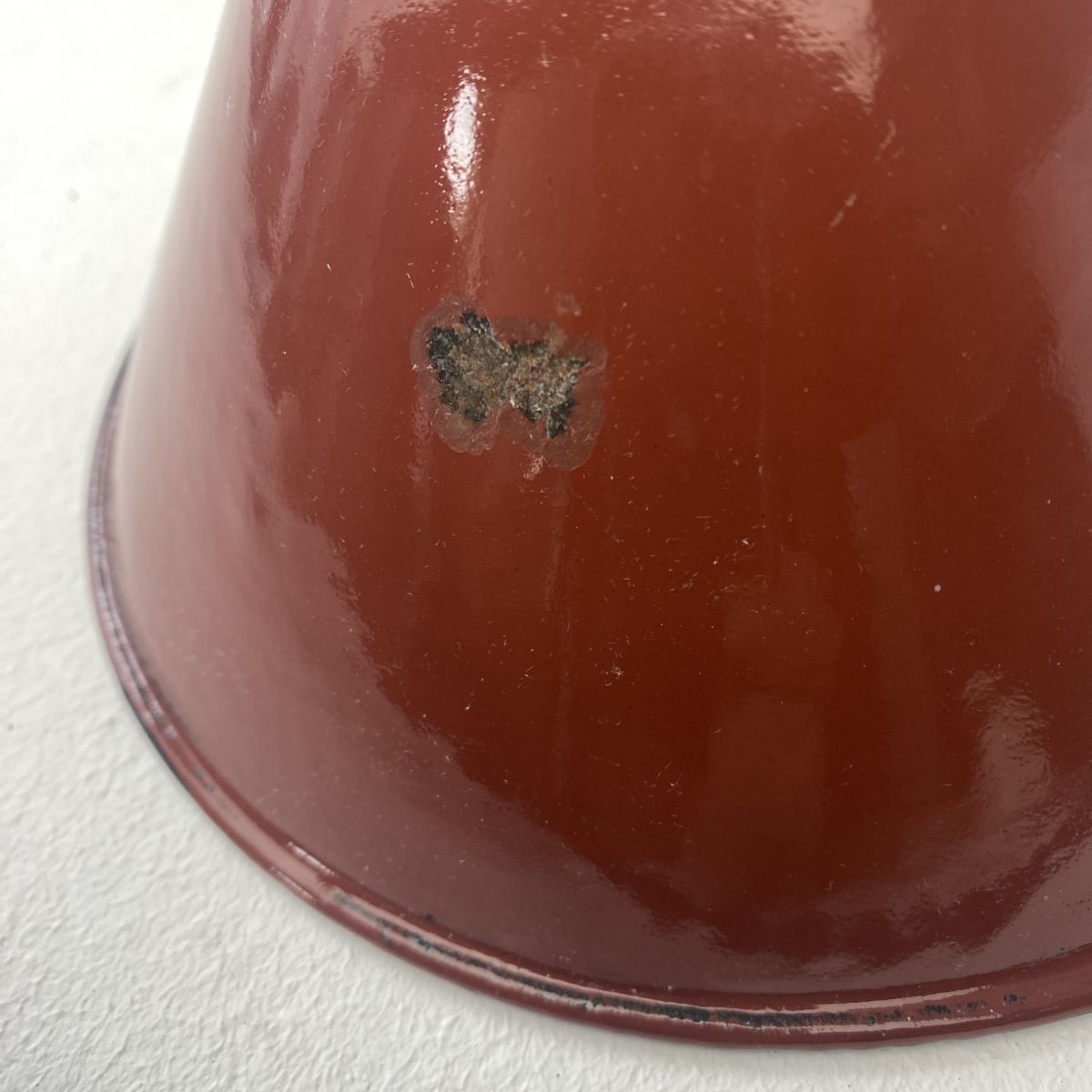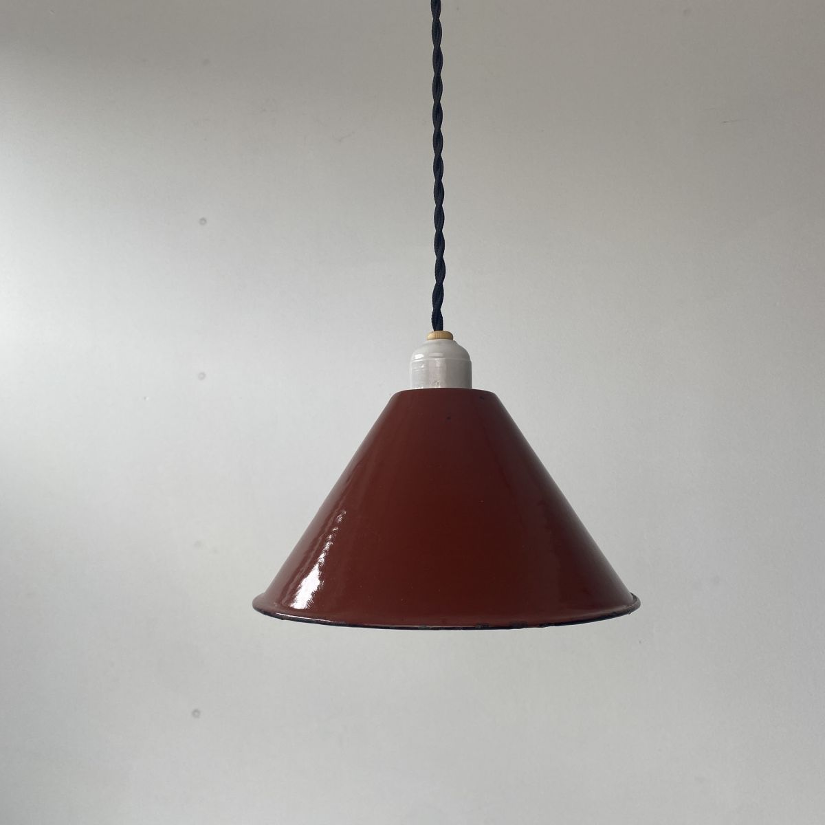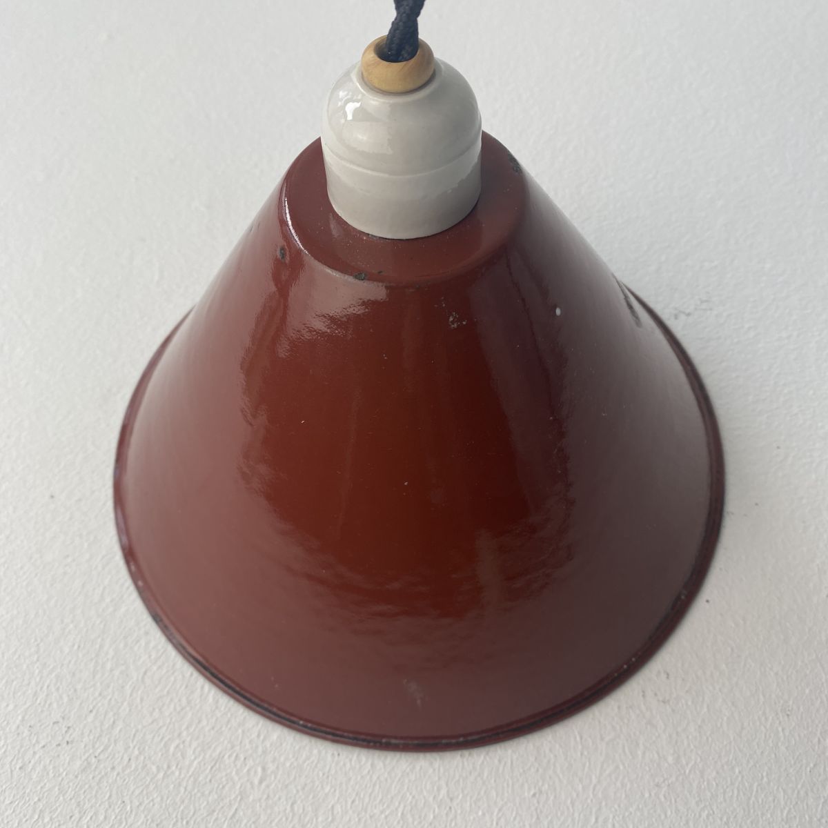 Ancienne suspension conique en tôle émaillée. Années 1950. Rare en émail rouge. En bel état général pour son âge. Sautes d’email et trace de rouille.