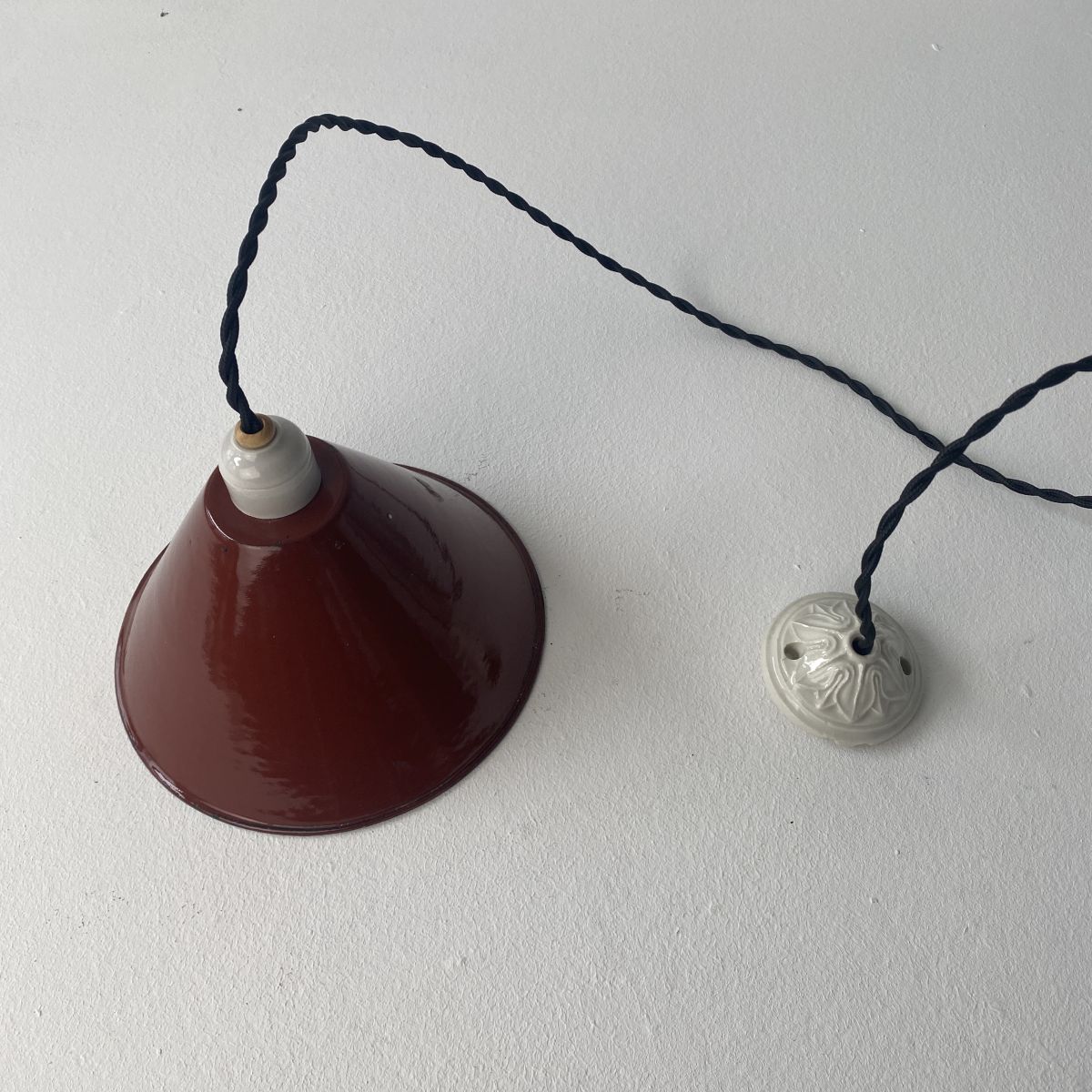 L’électricité a été refaite, avec douille à baïonnette (Ampoules B22). Branchement par domino. Fil noir en tissu tressé et rosace de fixation en porcelaine.
