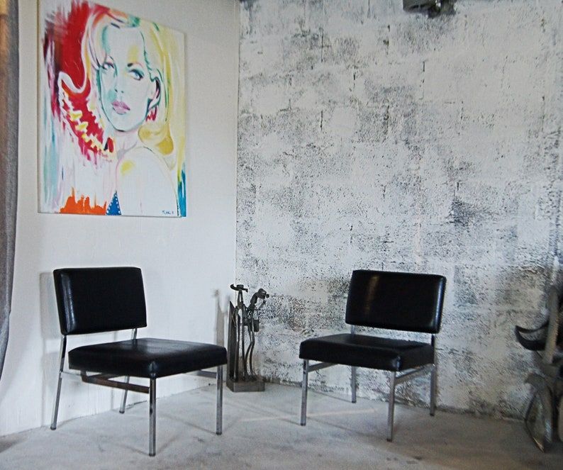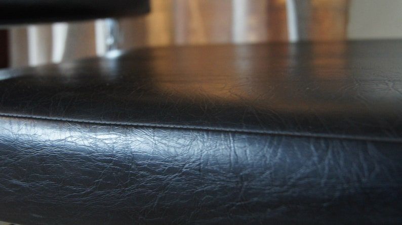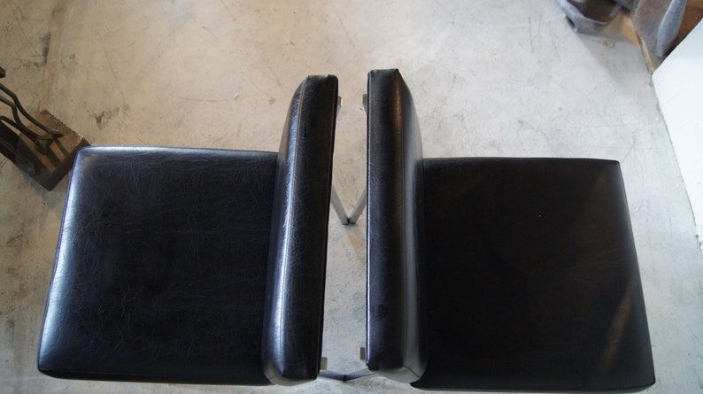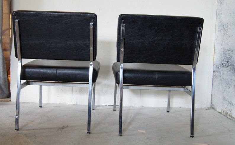 La structure des chaises est en acier chromé. L'assise et le dossier sont recouverts d'un simili cuir noir. Les chaises de fauteuil sont de style Pierre Guariche, mais elles ne sont pas estampillées.