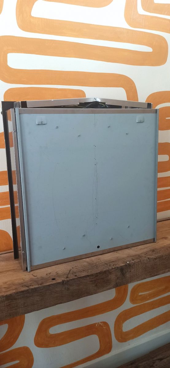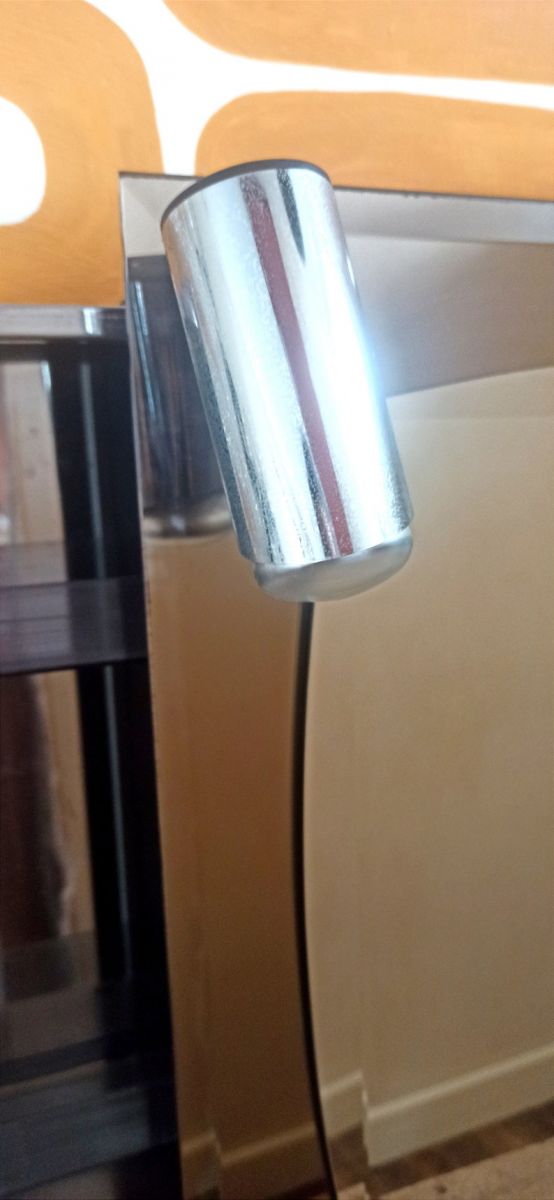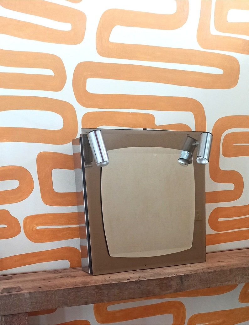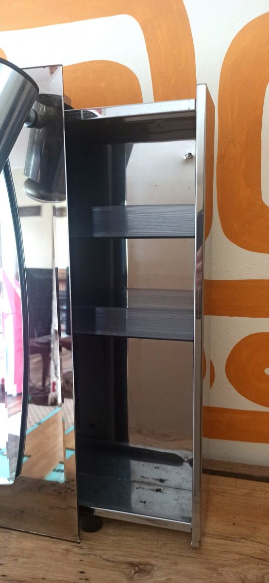 Elle possède un système de rangement à glissière situé à l'arriere du miroir avec 5 étagères ainsi que 2 spots à relier au circuit électrique (présence de système électrique sur les spots). Le miroir bi-color de style Fontana arte est en Bon état. Il possède des petites traces du temps passé mais n'a qualité et le charme de celui-ci.