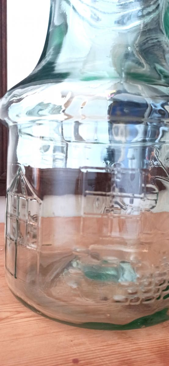 Dimensions de la bouteille : Diamètre du haut 14cm, diamètre du bas 20 cm, hauteur 35 cm.