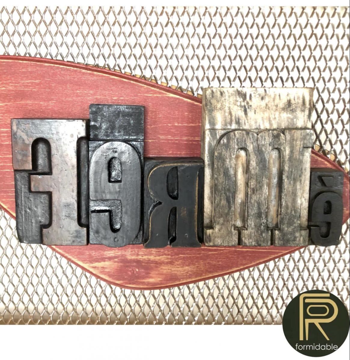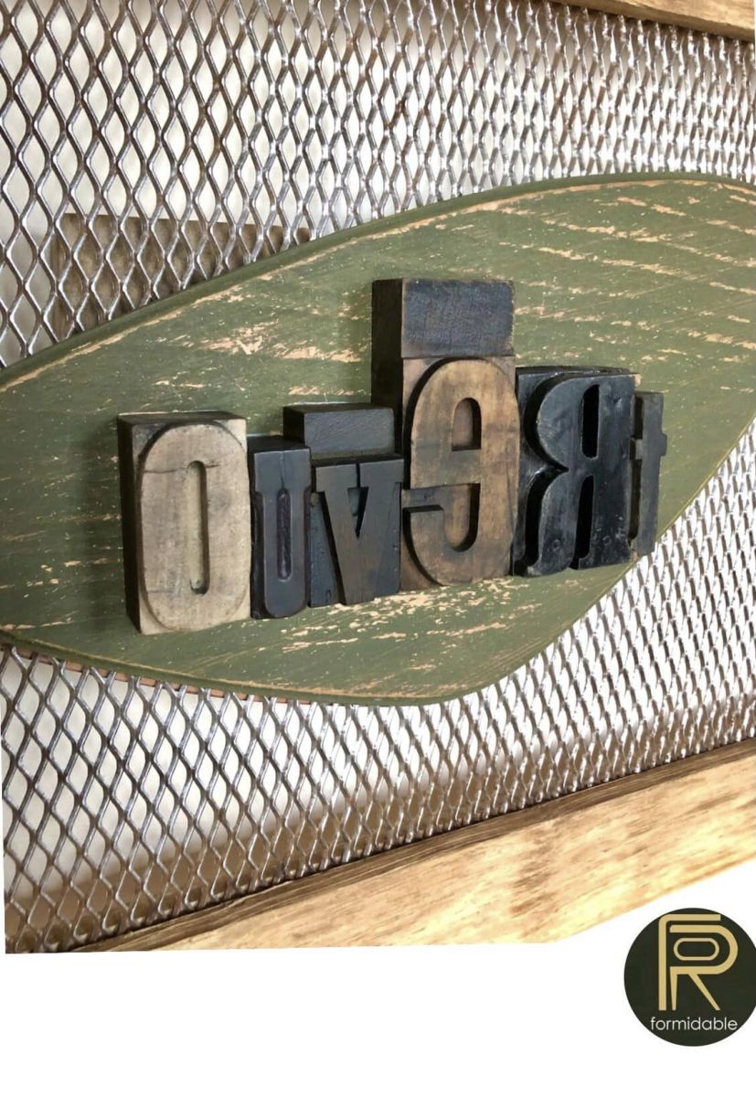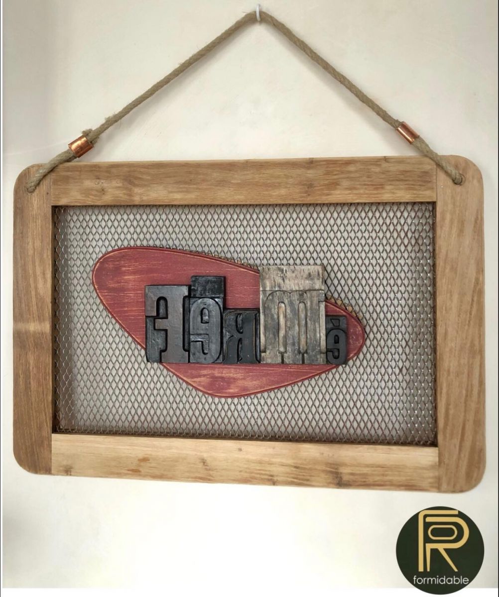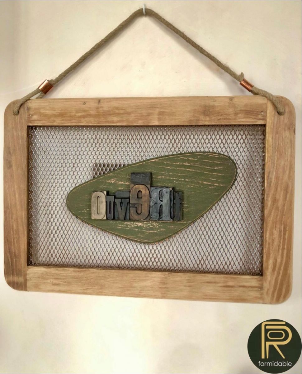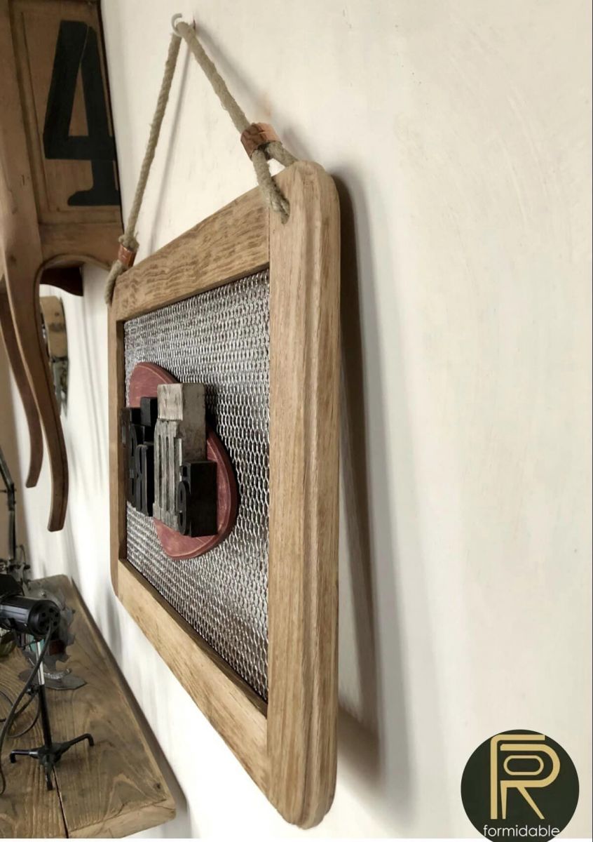 Réalisation originale et créative, avec un encadrement en chêne sculpté , une grille métallique pour le jeux de transparence et des lettres en caractère d'imprimerie vintage pour le côté originale du panneau.