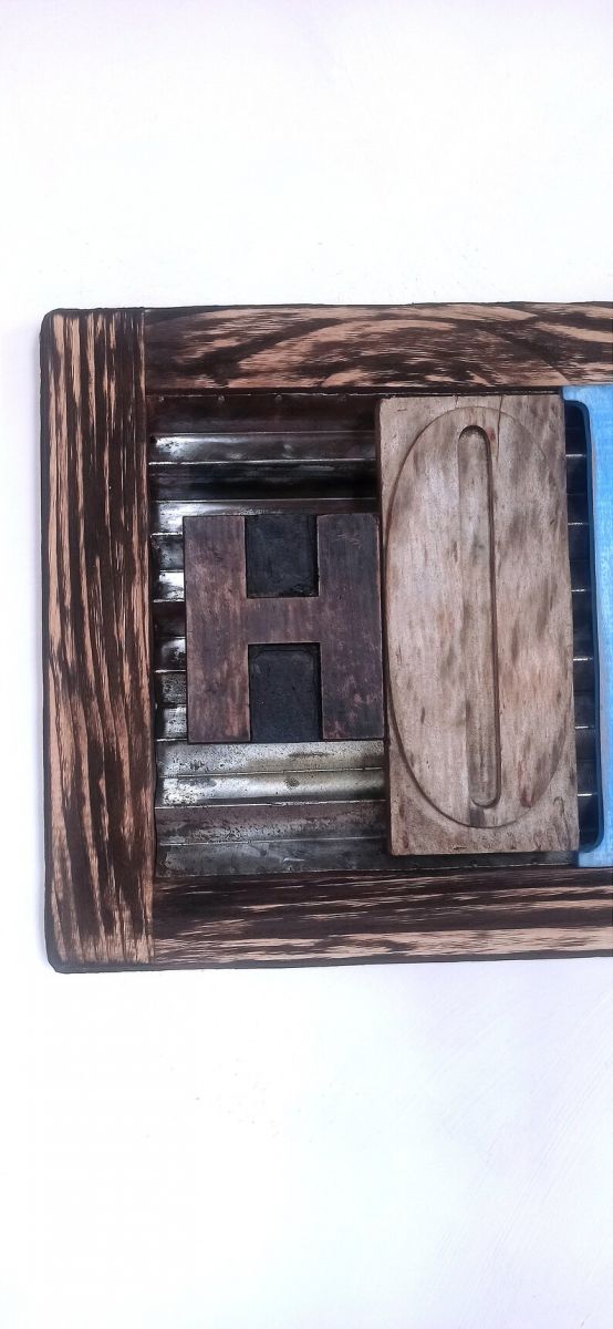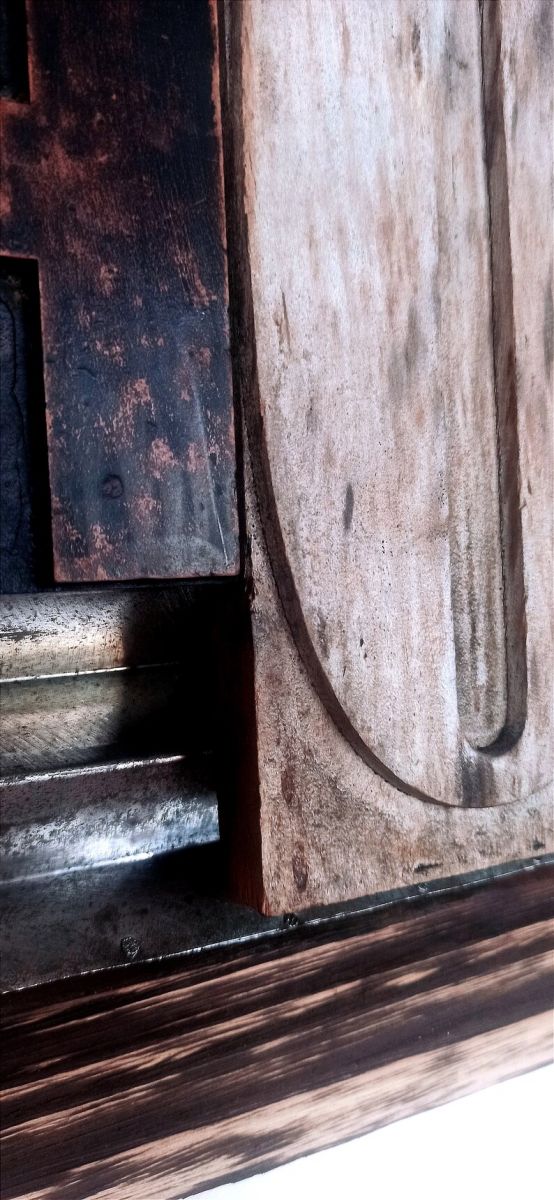 Le tableau est composé d'un cadre en bois brossé noir sur un fond orné d'une plaque metalique ondulée.