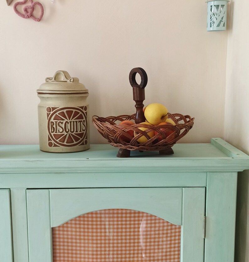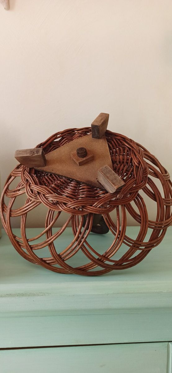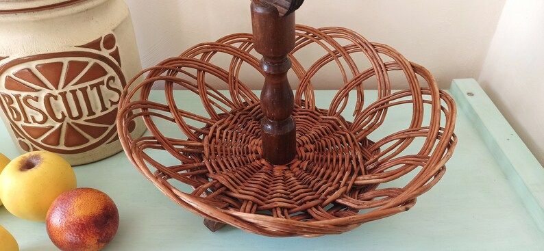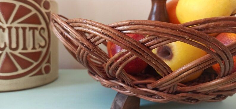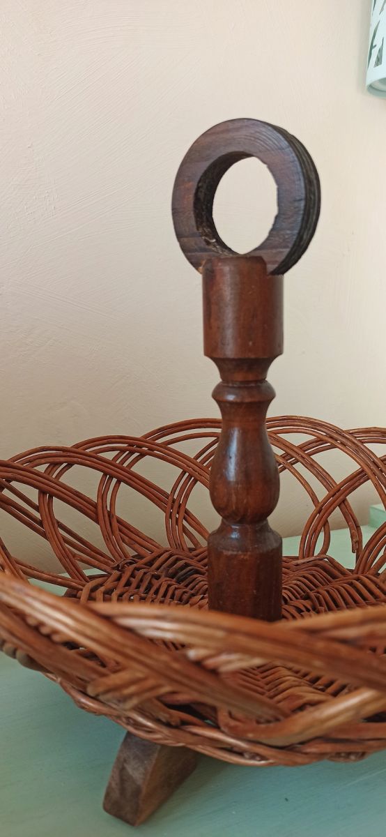 Bonjour, aujourd'hui je vous propose ce panier à fruits en osier. Autant décoratif que pratique, ce joli panier trouvera sa place dans de nombreux endroits de la maison. Ici, en panier à fruits mais il peut servir de vide poches, dans une salle de bain etc..sa poignée en bois permet un transport facile. Celle-ci est visée sous le dessous du panier. Il repose sur 3 pieds en bois. Le panier n'est pas neuf mais en bon état vintage.