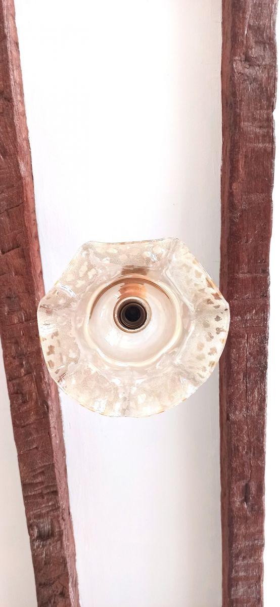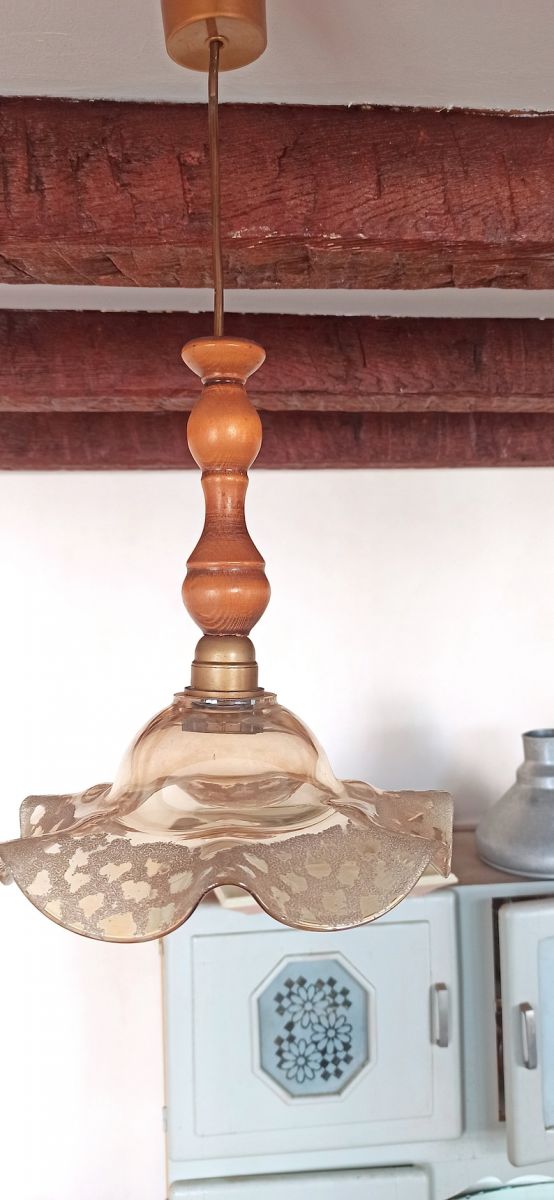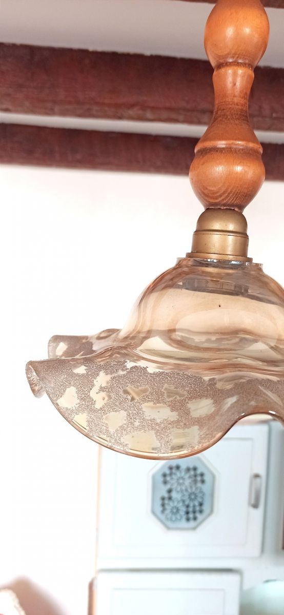 Bonjour, aujourd'hui je vous propose un lustre. Beaucoup de charme pour ce lustre de forme ronde avec une création de vagues ou corolle d'accord une fleur. Décor en relief sur le verre.