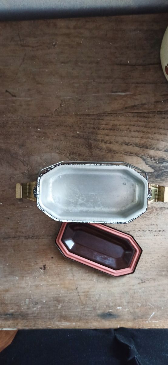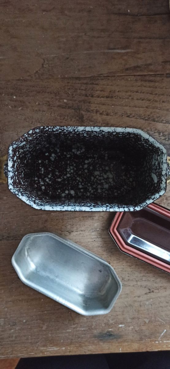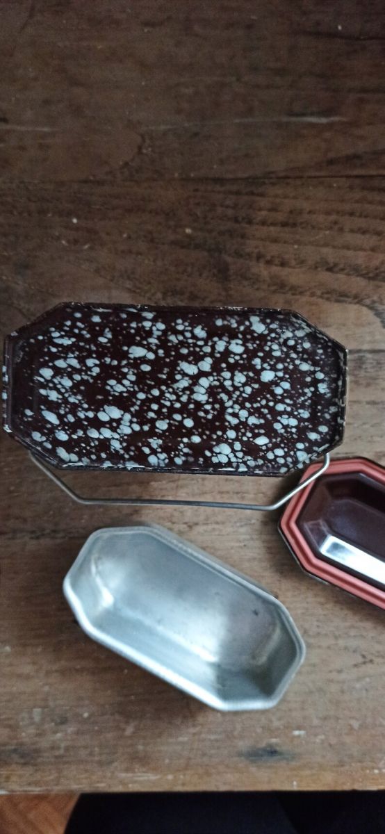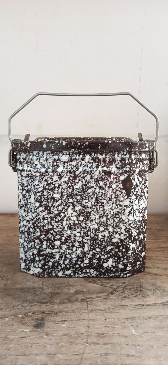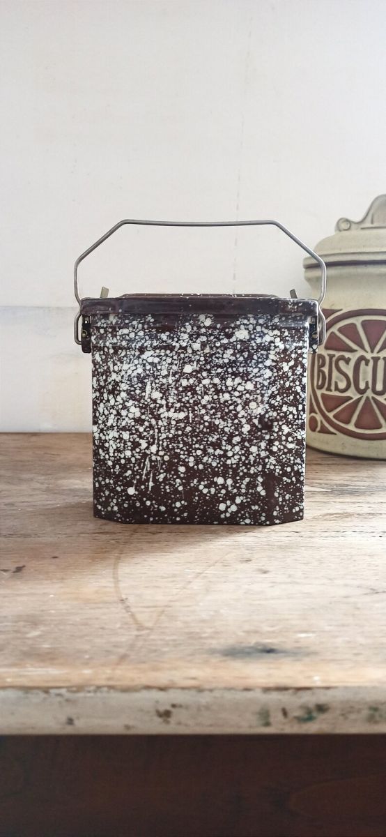 Bonjour, aujourd'hui je vous propose une boîte ancienne émaillée bi-colore marron et blanc. Parfait pour apporter un petit en cas. Elle se transporte facilement grâce à sa anse métallique. Elle est muni d'un couvercle complètement hermétique et d'un bac en inox. Elle se ferme très bien grâce aux système d'attache sur les côtés. La boîte est en bon état, pas de corrosion qui empêche de se servir de la boîte. Elle possède quelques petites marques du temps passé.