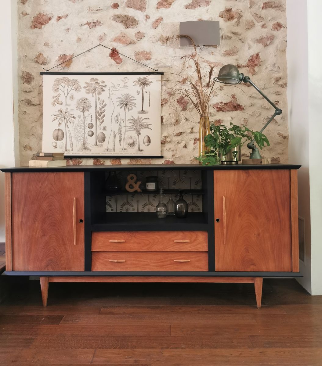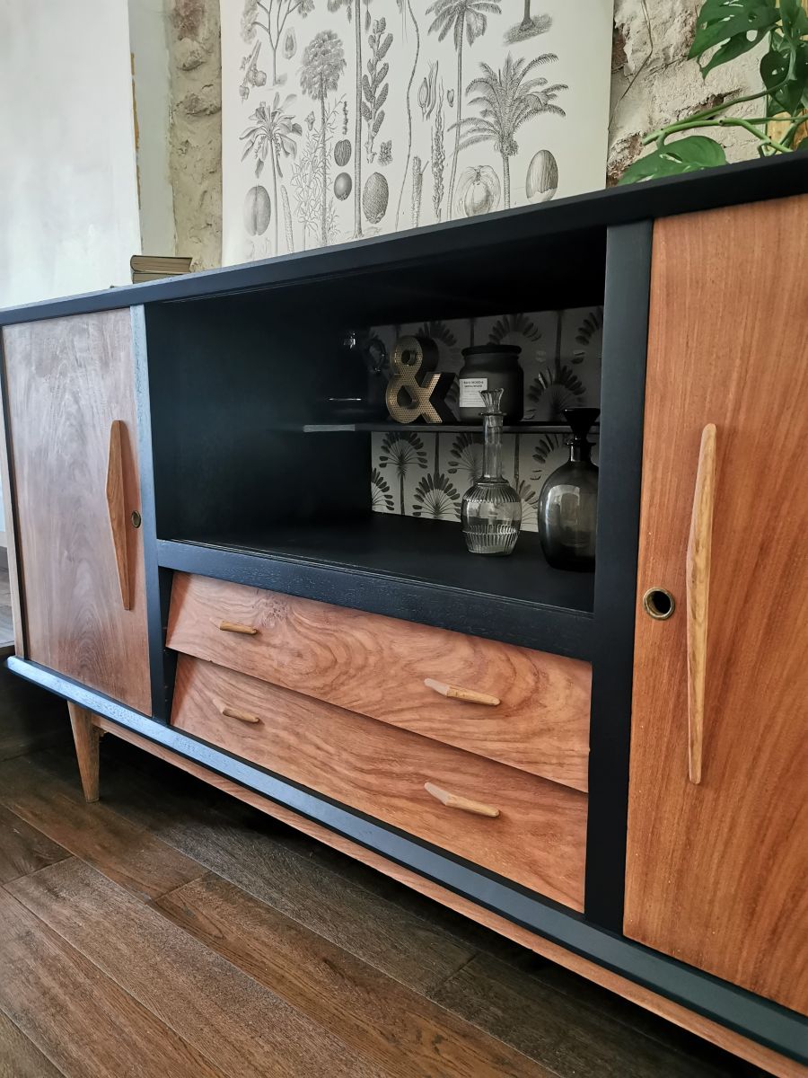 Upcycling d'un meuble ancien avec ses lignes vintages, ses pieds compas et les poignées en bois d’origine.