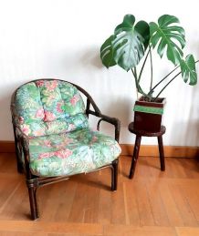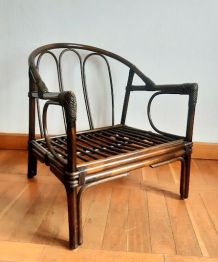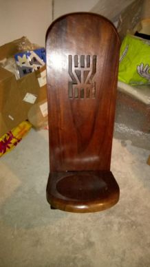 Petit fauteuil bohème en bois massif, coussin en tissu noir et blanc (quelques tâches, prévoir un changement de tissu), manque le barreau du haut du dossier, entièrement traité contre les insectes et repassé au rénovateur de bois, traces d’usage, hauteur totale 75cm, hauteur assise 28cm, assise 50x50cm, dimensions totales (cm) : L.62xH.75xP.60.