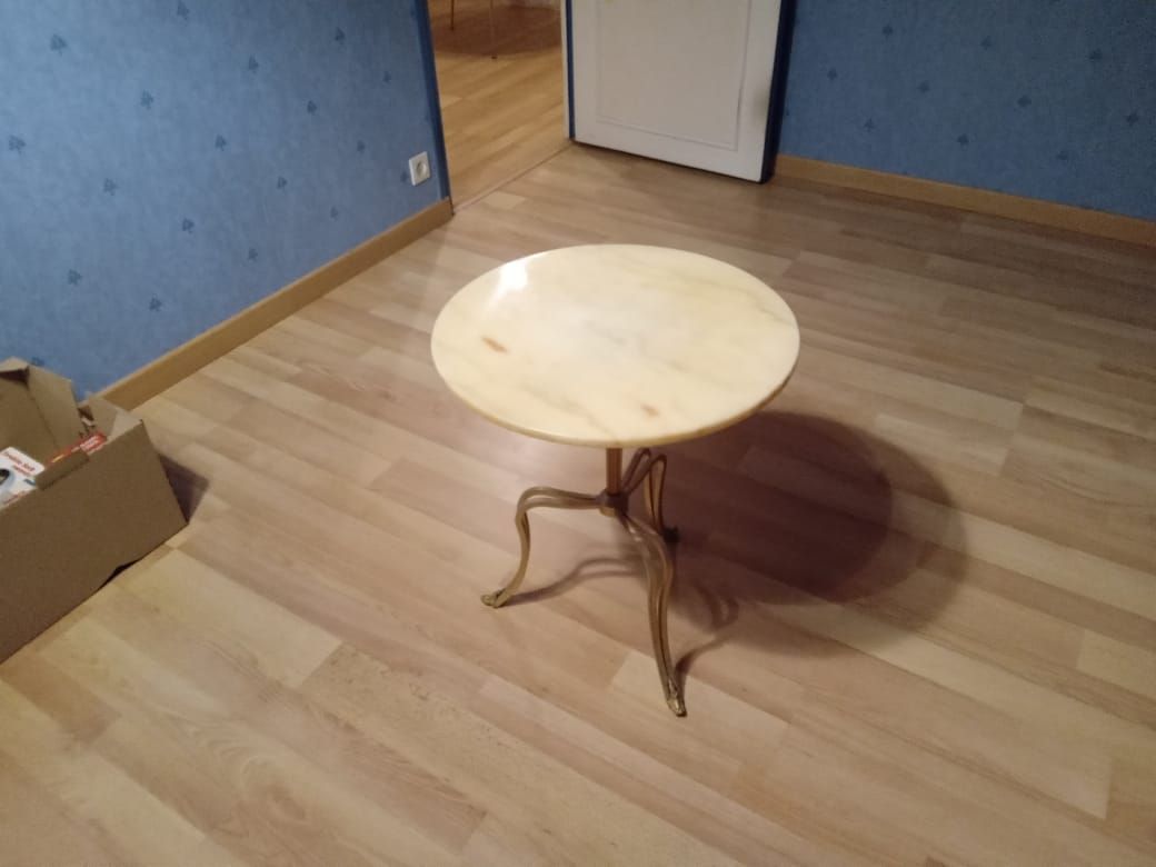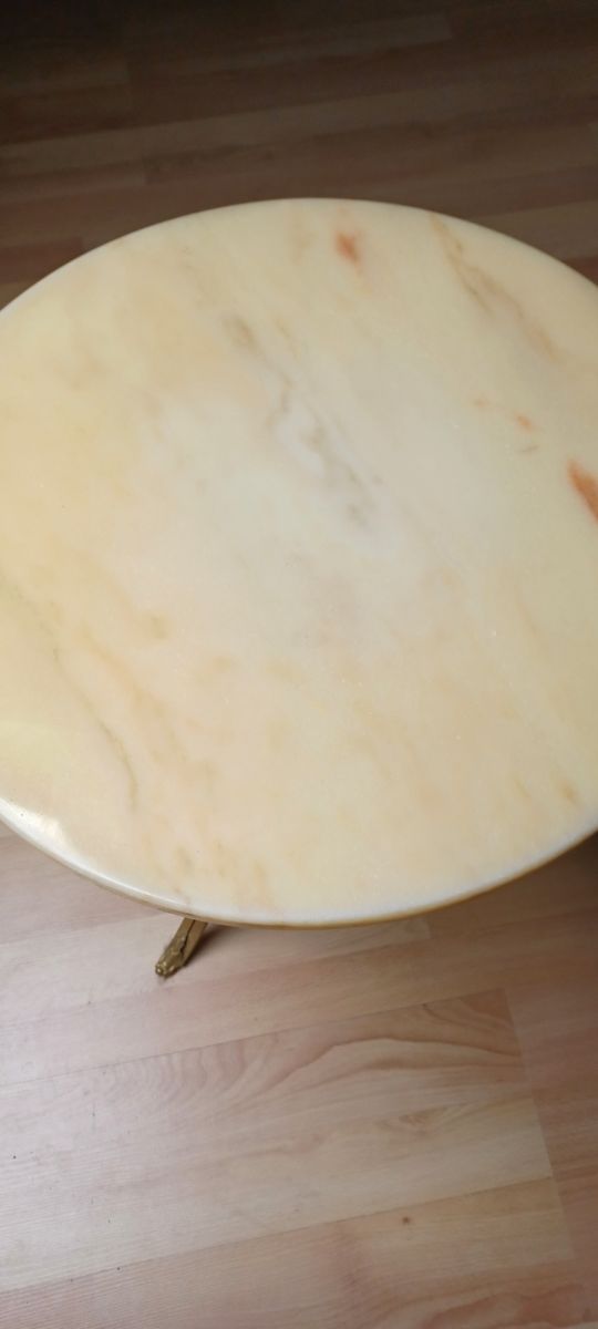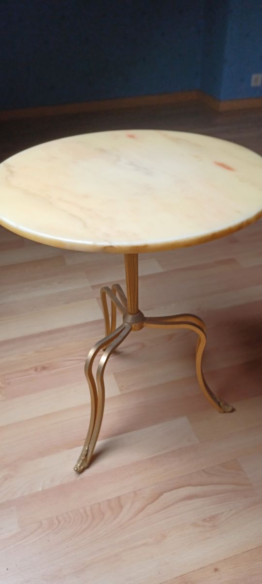 Plateau amovible dans les tons beige (en marbre ou albâtre) posé sur trois pieds en métal doré.