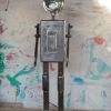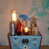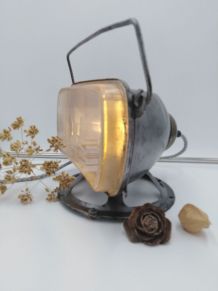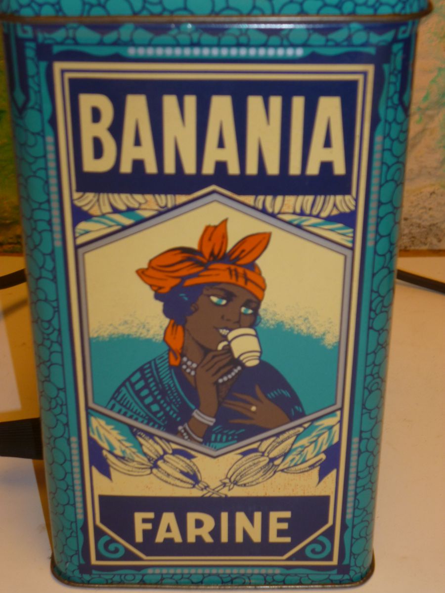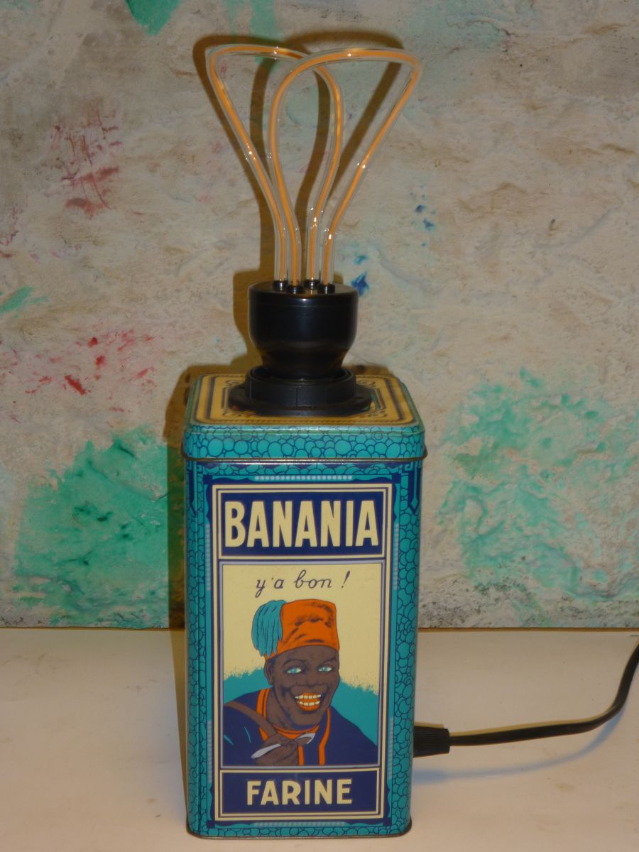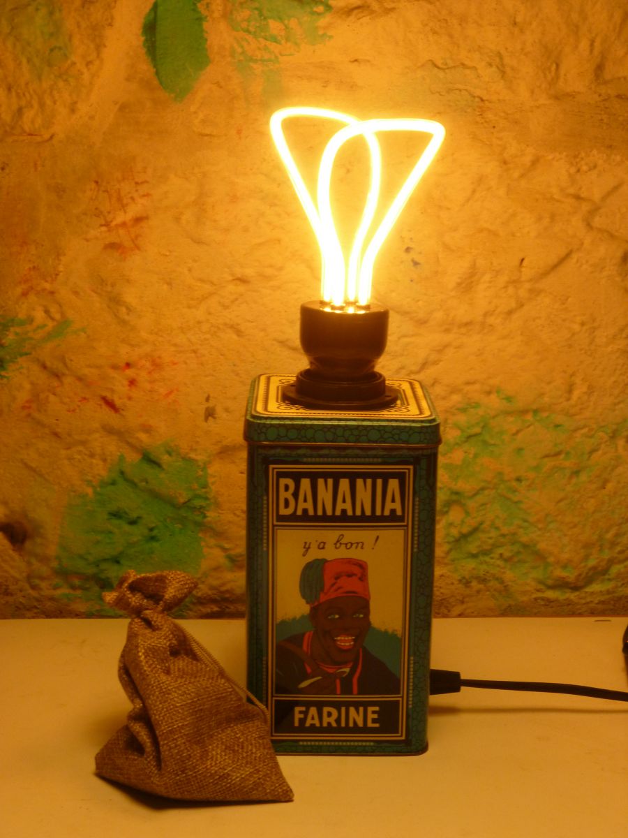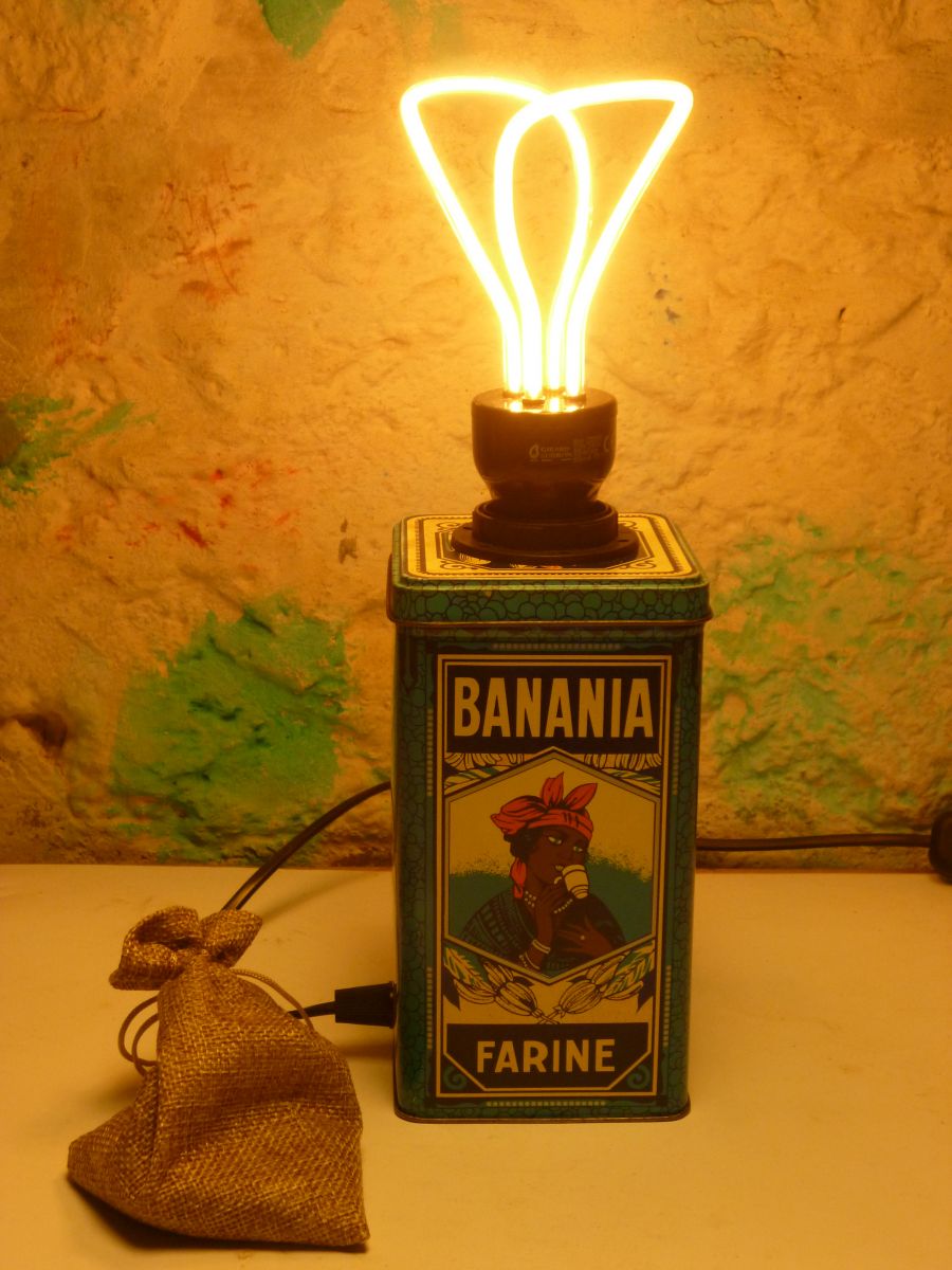 Lampe de table , chevet , d'appoint ,réalisée a partir d'une boite métallique " BANANIA - FARINE " .