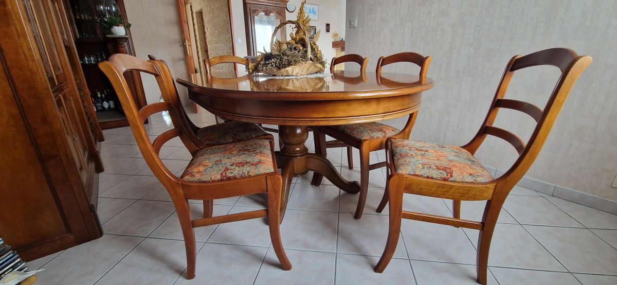 Salle à manger 6 chaises + table ronde + 2 rallonges.