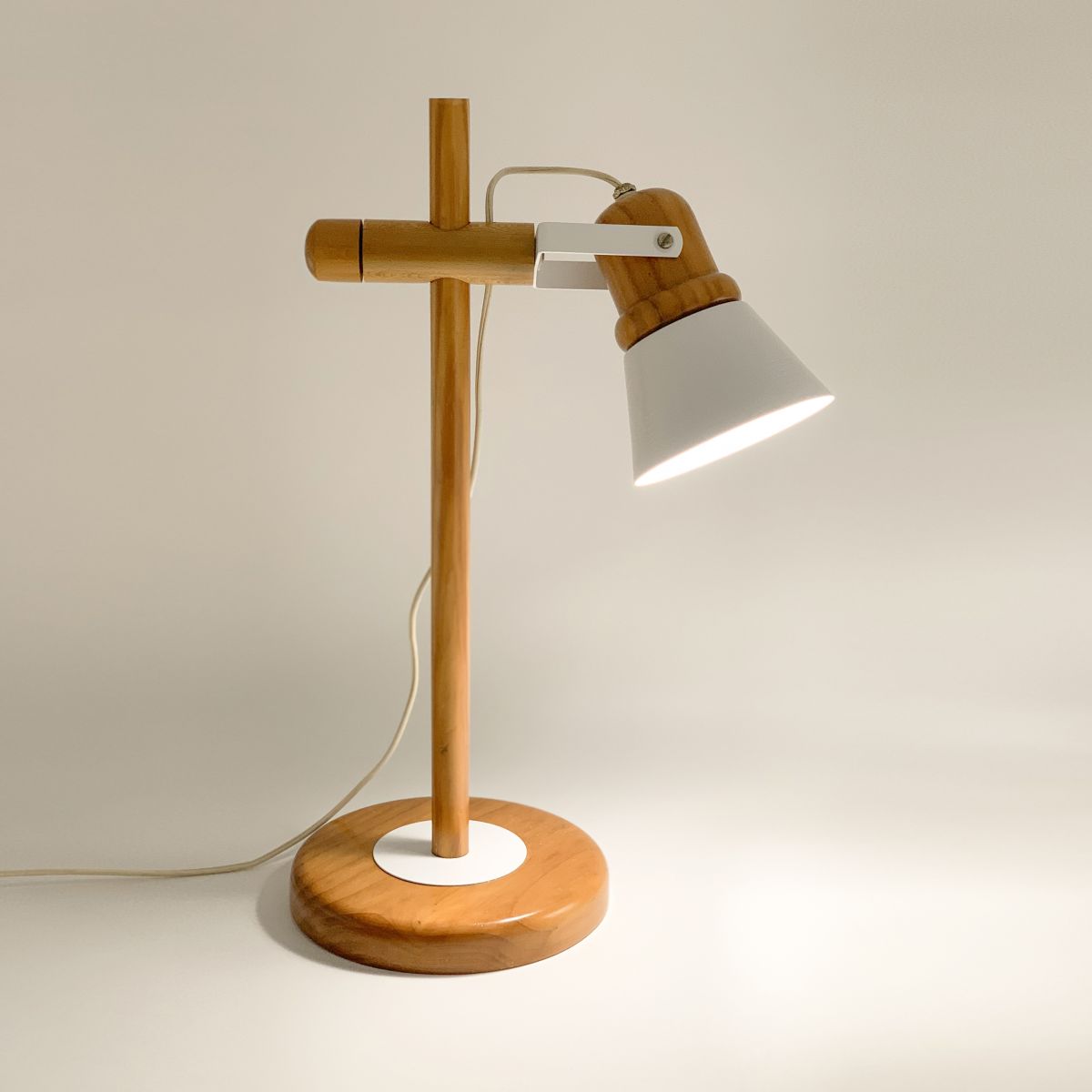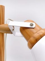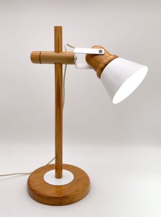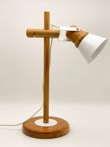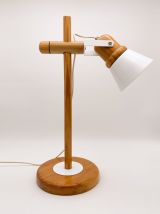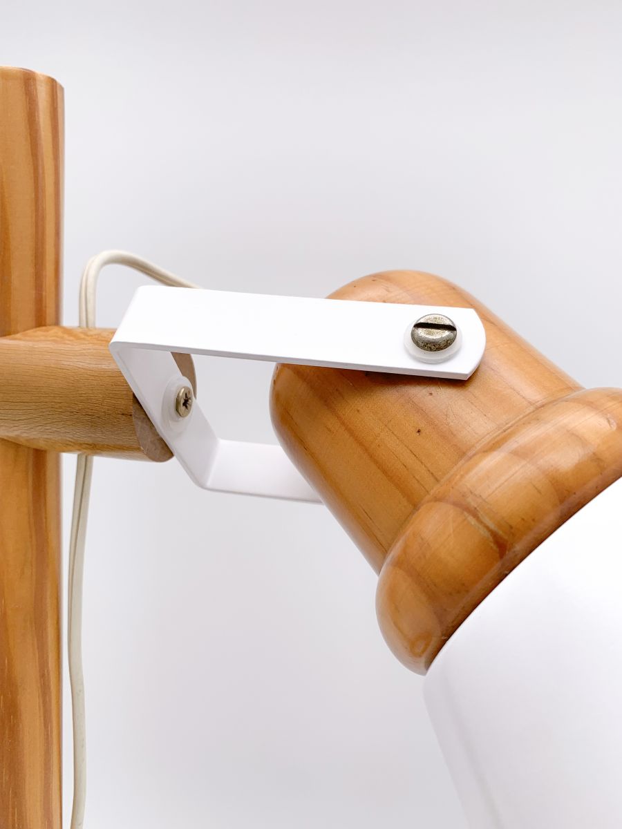 Lampe vintage scandinave en bois de pin et métal des années 60/70. Entièrement restaurée (peinture et électricité), elle est en très bon état. Cette lampe trouvera sa place facilement sur votre bureau ou simplement en lampe d'appoint grâce à son design original associé au bois massif et métal blanc. La hauteur et l'inclinaison de l'abat-jour sont réglables.