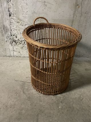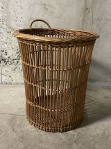 Corbeille à papiers d’école en rotin des années 60, hauteur 41cm, diamètre 38cm, bon état.