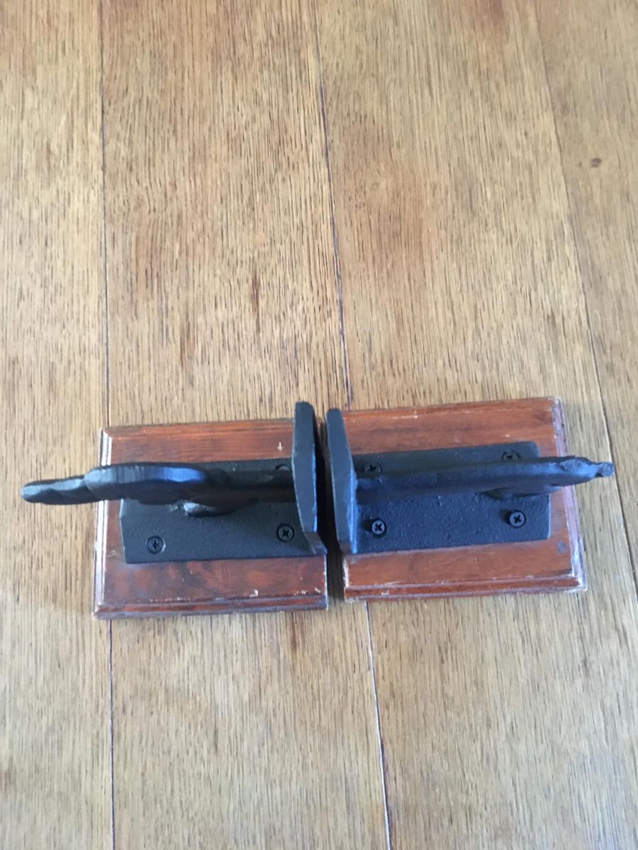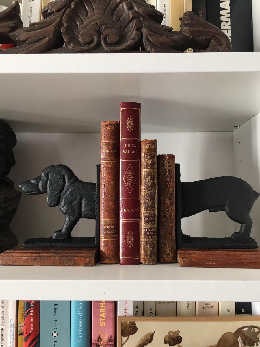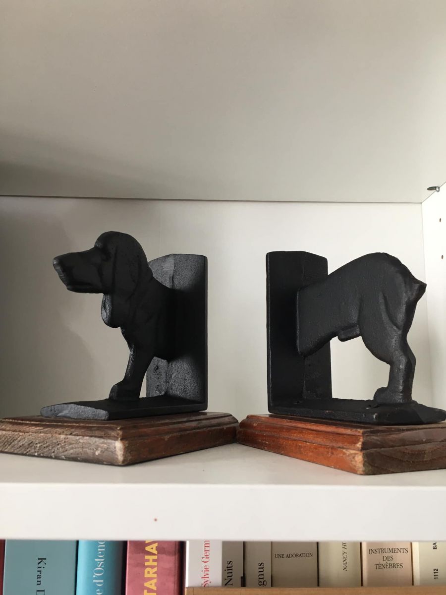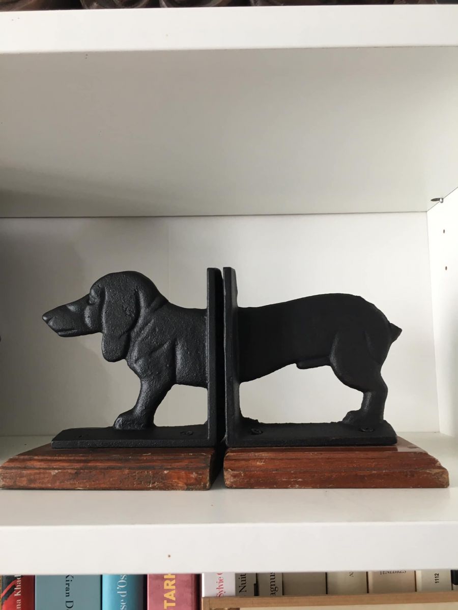Serre-livres en métal sur socle en bois. En forme de chien.