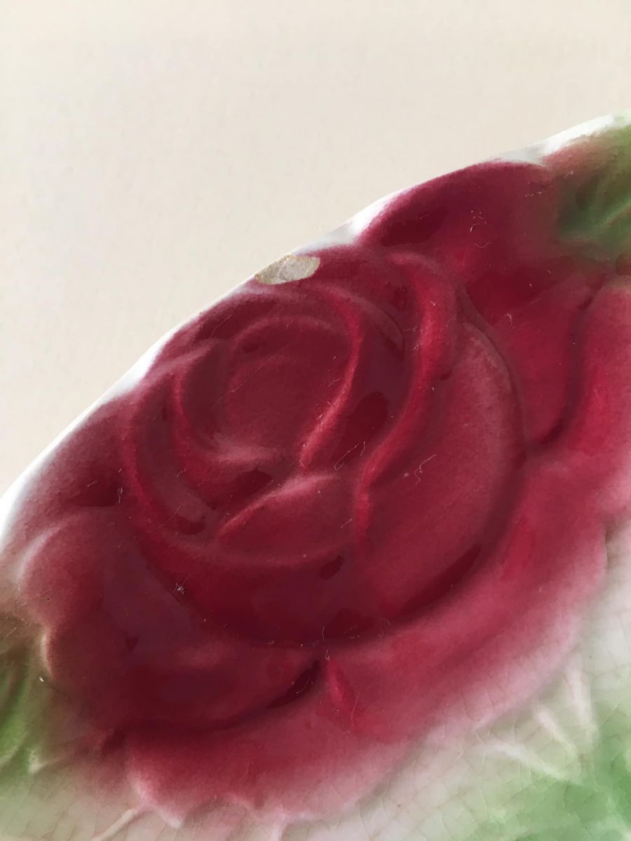 Ancienne assiette plate en barbotine à décor de roses Majolica.