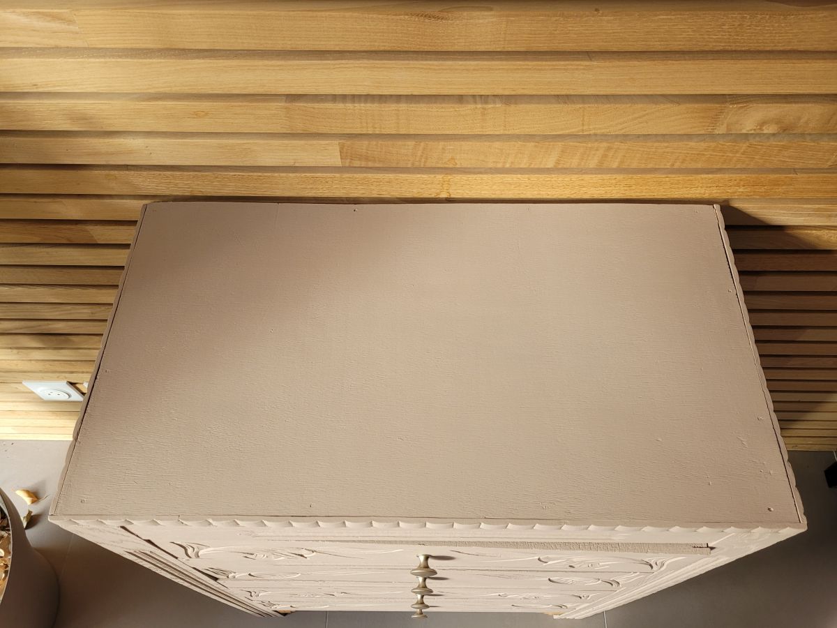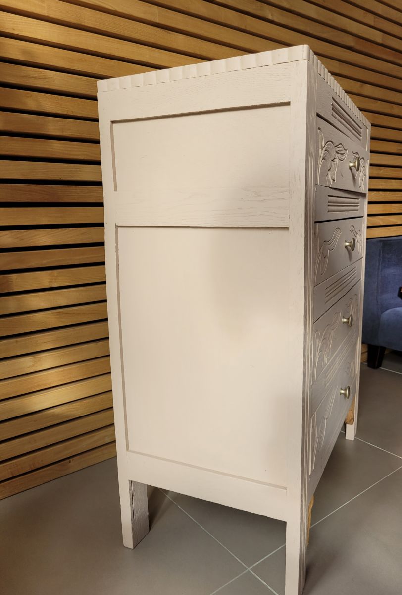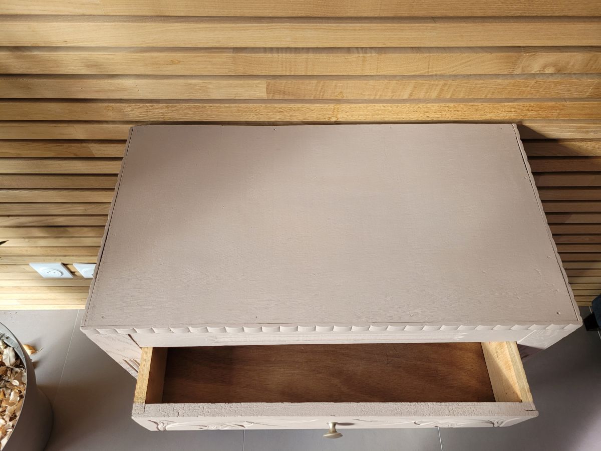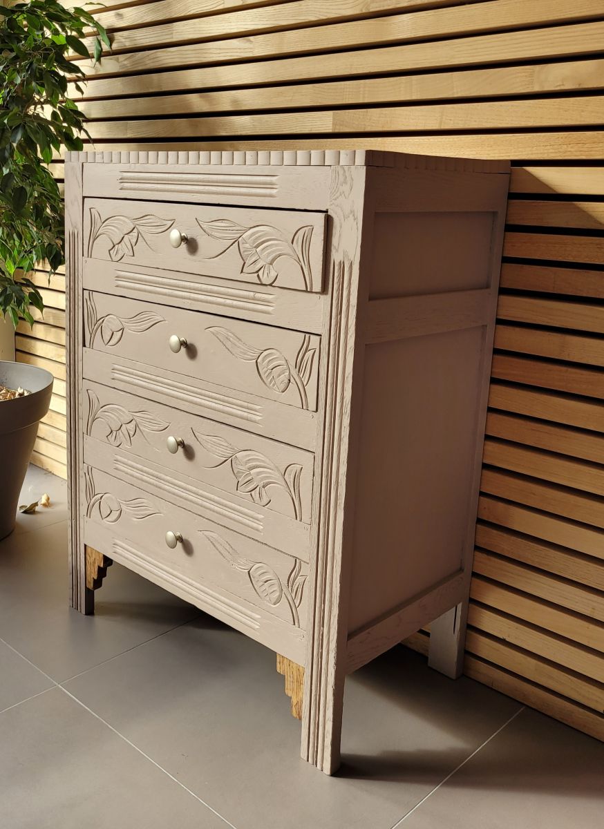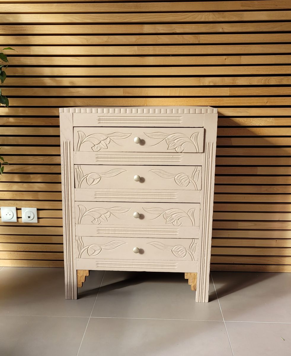 Commode art déco vintage en bois massif. Elle a été entièrement restaurée: nettoyée, poncée repeinte dans la couleur "Dead salmon" de chez Farrow and Ball (finition matte). La commode est en bon état. Compte tenu de l'âge du meuble, le bois a travaillé par endroits, notamment sur la façade du 1er tiroir qui est décalée. Le meuble est sain, stable et propre. Les tiroirs coulissent parfaitement.