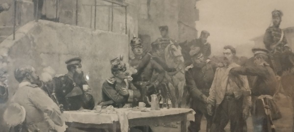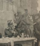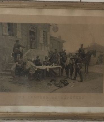 Gravure d'époque sur le thème de la guerre avec la Prusse. Le Porteur de dépêches est considéré comme un espion et généralement aussitôt passé par les armes ... Le suspens de ce courageux officier qui fasse à une mort installée par la guerre, obséquieuse et ricanant impose un silence dramatique dans ce face à face entre l'héroïsme du soldat jusqu'au don de sa vie et la cruauté de la guerre.