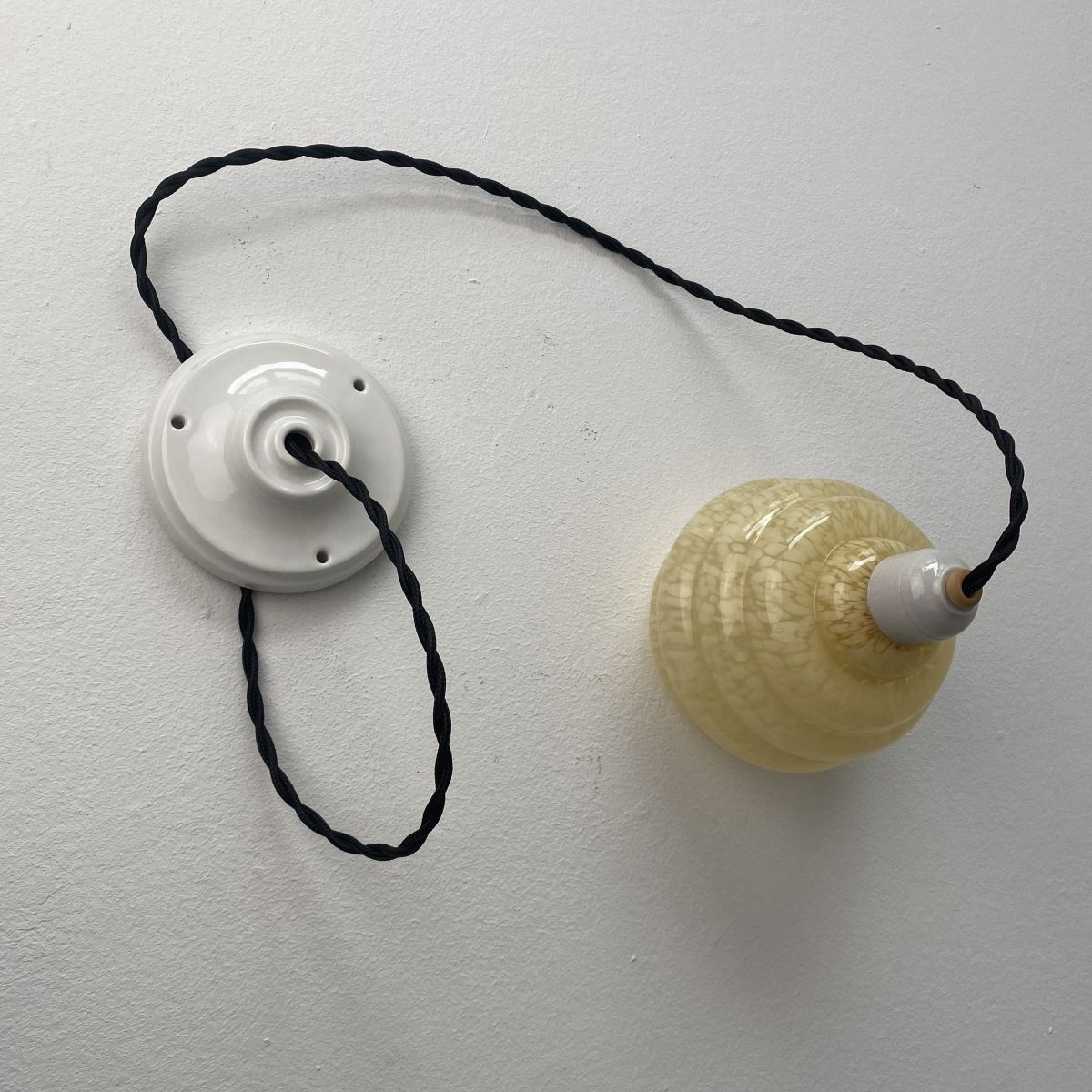 Branchement par domino. Fil noir en tissu tressé et rosace de fixation en porcelaine.