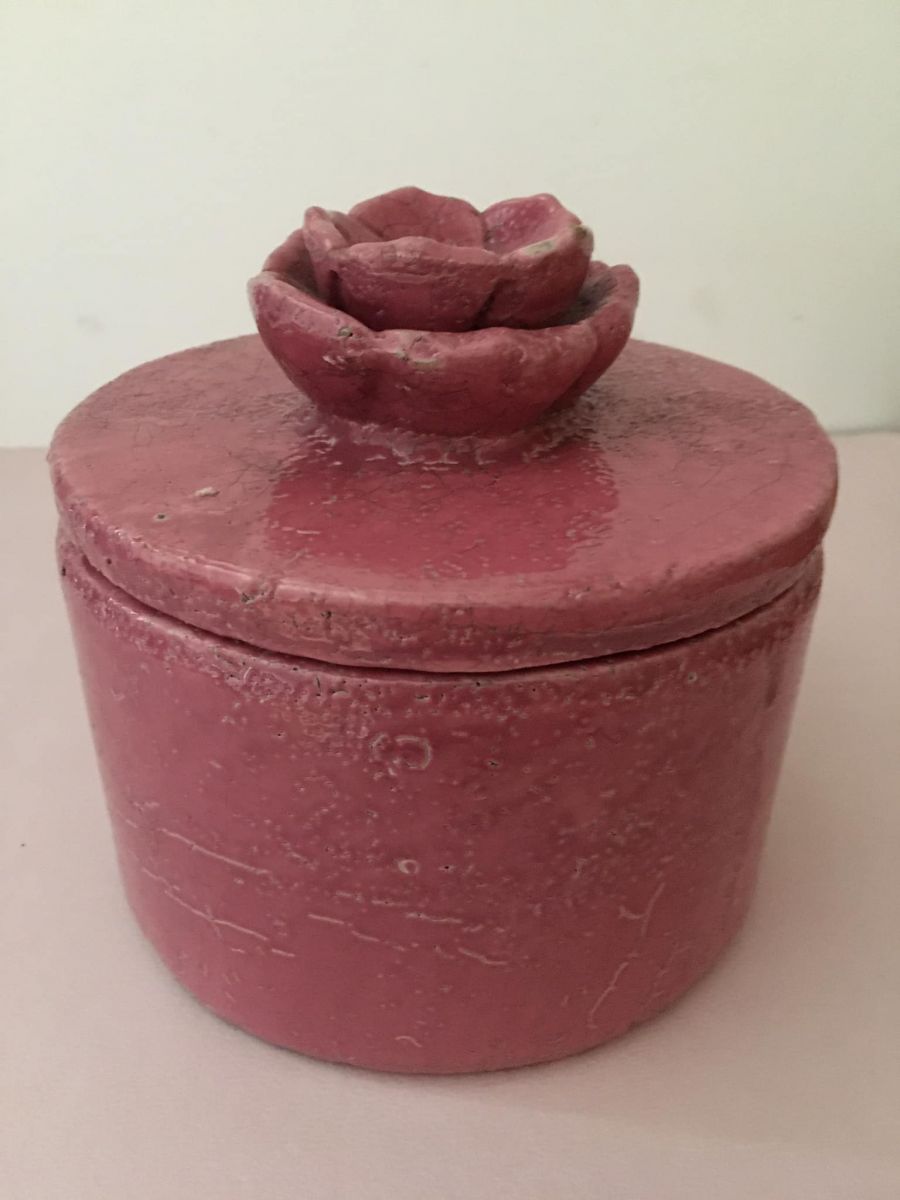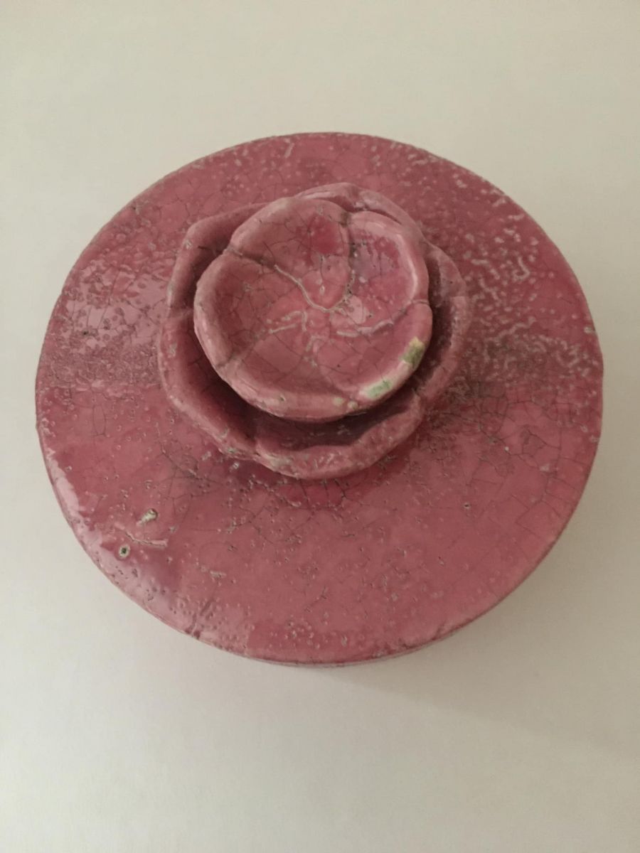 Belle boîte en céramique raku de couleur vieux rose à l’extérieur et grise à l’intérieur. Poignée en forme de rose.