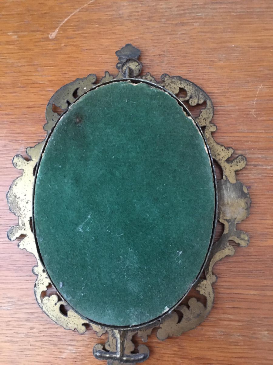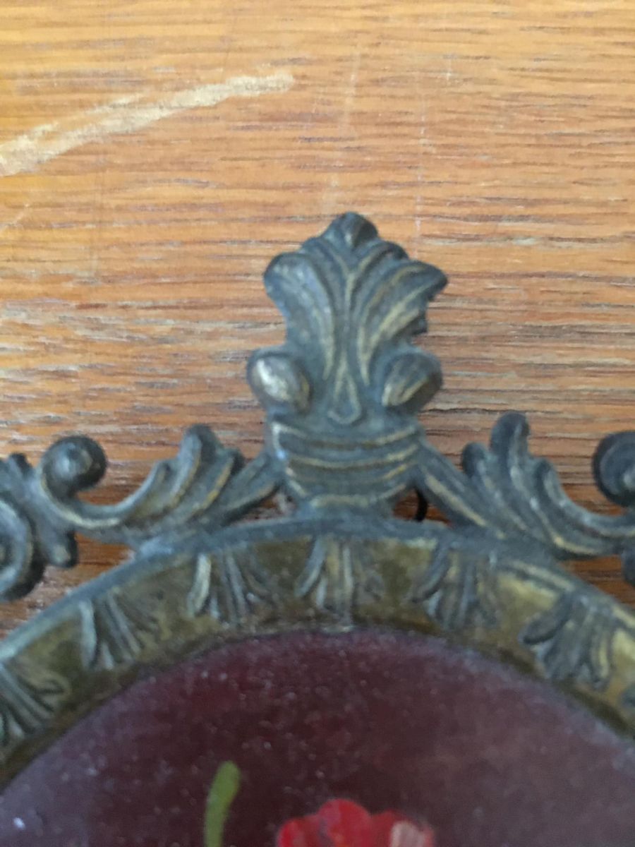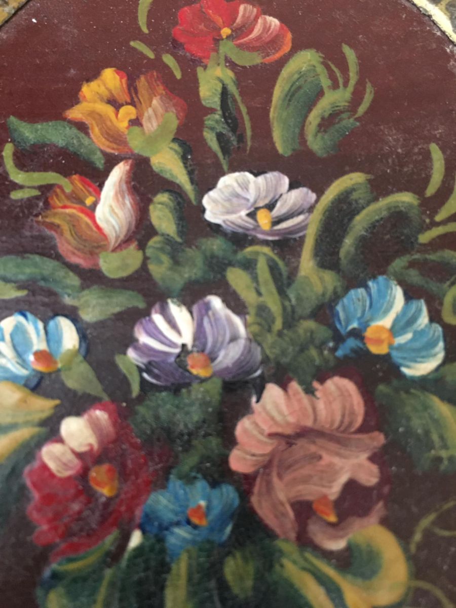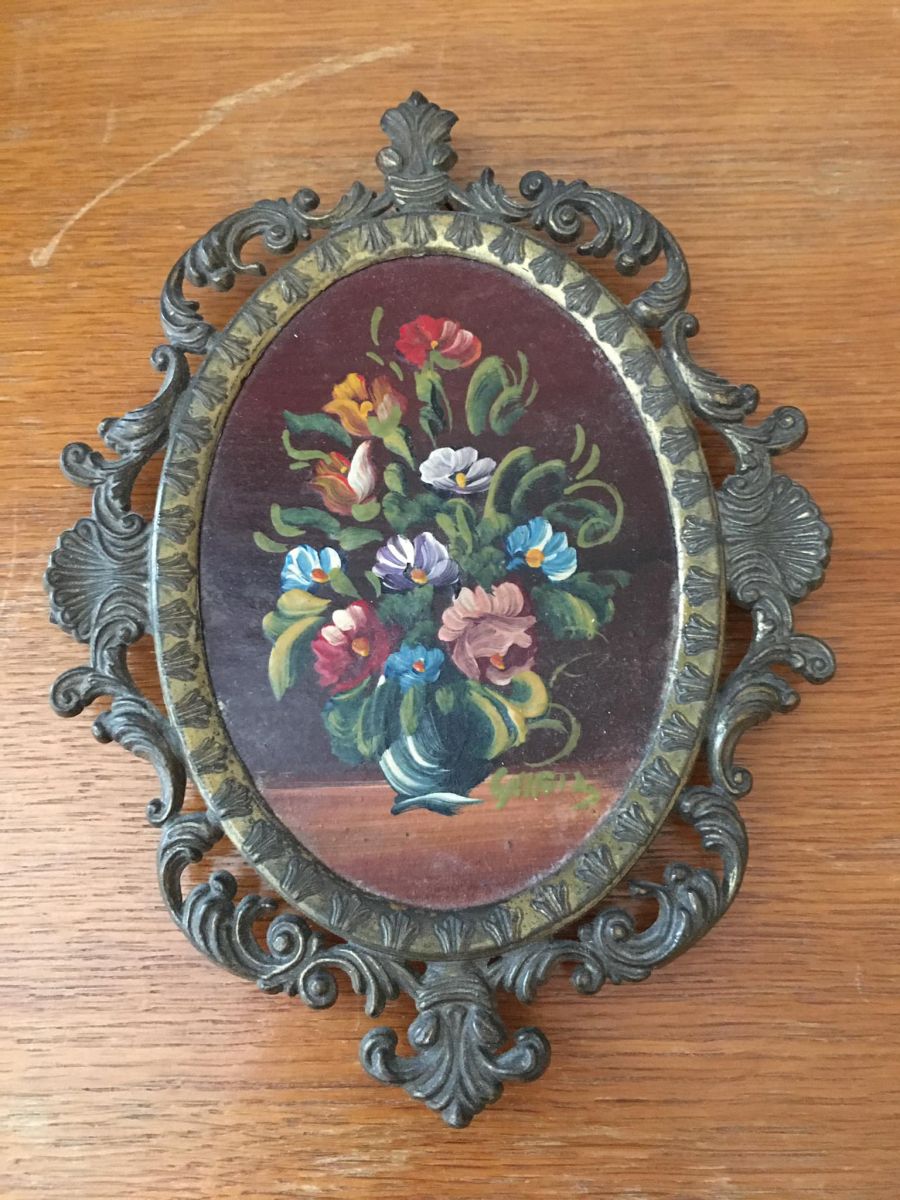 Petit cadre en métal doré et peinture sur bois avec charmant bouquet de fleurs. Signature inconnue.