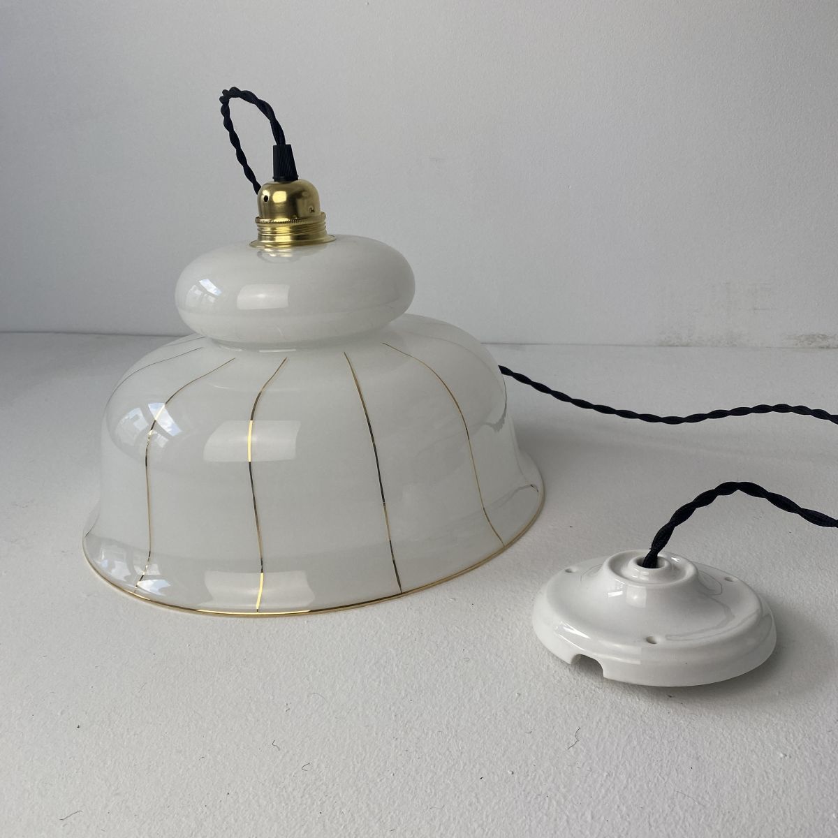 L’électricité a été refaite. Douille à vis gros culot (Ampoules E27). Branchement par domino. Fil noir en tissu tressé et rosace de fixation en porcelaine.